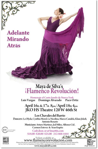 | Flamenco artist Maya de Silva brings her Flamenco Revolución, a company of 12 musicians and dancers, to the Jacqueline Kennedy Onassis Theatre (120 West 46th Street) for their second New York season, April 16-18. In a show titled “Going Forward, Looking Back,” each performance will honor one of the Senior Flamenco Singers of NY – Luis Vargas on Friday, April 16; Domingo Alvarado on Saturday, April 17; and on Sunday, April 18, the late Paco Ortiz.