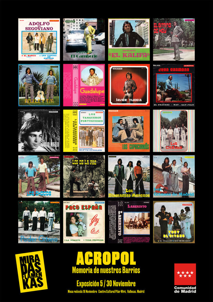 La exposición Acropol, memoria de nuestros barrios, comisariada por Daniel Gutiérrez y Pablo López, propone un fascinante recorrido por las portadas de este mítico sello que nació en Madrid de la mano del empresario egipcio, Noumbar Hamatjis, a finales de los años sesenta, y que ayudó a difundir el llamado Sonido Caño Roto. La empresa se convirtió en punto de encuentro de artistas flamencos captados para grabar rumba madrileña en la zona de los mesones de la Plaza Mayor, la Cava Alta y Baja o la Plaza de Santa Ana. La mayoría de estos artistas eran familia de Las Grecas, Los Chorbos o El Luis, en lo más alto de las listas de éxitos de entonces.