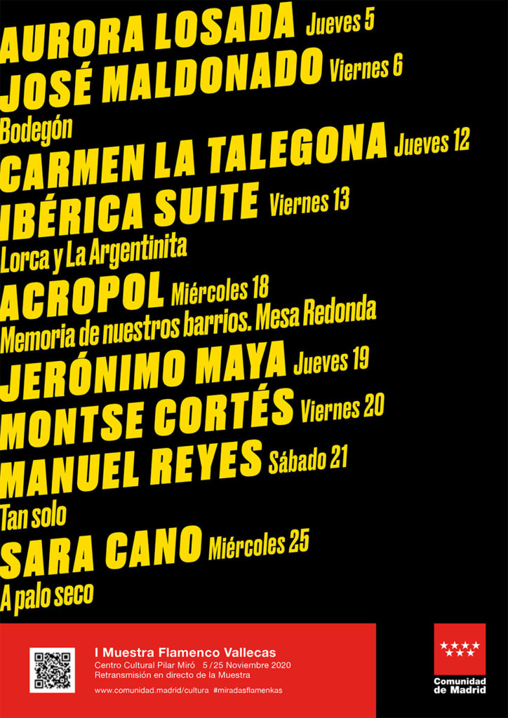 La Muestra Flamenco Vallecas, organizada por la Comunidad de Madrid, tendrá lugar durante el mes de noviembre en el Centro Cultural Pilar Miró con el espíritu de que el flamenco vuelva a estar en la calle en estos tiempos difíciles.