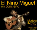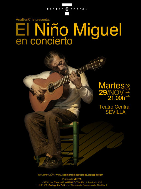 La directora del Instituto Andaluz del Flamenco, Mª Ángeles Carrasco, ha presentado hoy en Sevilla el cartel del concierto del guitarrista onubense 'Niño Miguel'. Una cita muy esperada por el público ya que hace seis años que el artista no se sube a un escenario. Le han acompañado en el acto, además de los organizadores, Benoît Bodlet y Chechu García-Berlanga, su hijo, Ángel Vega. «Niño Miguel es un guitarrista de guitarristas, fuente de conocimiento de otros compañeros de profesión y uno de los artistas más grandes que ha dado el flamenco», ha recordado Carrasco en su interveción, en la que también ha agradecido a los organizadores haber hecho partícipe al Instituto Andaluz del Flamenco en un evento tan importante. Por su parte, tanto Benoît Bodlet como Chechu García-Berlanga, han destacado la maestría de Niño Miguel, protagonista del documental que firman ambos 'La sombra de las cuerdas', en el que se resume la trayectoria del artista. Bodlet ha comentado cómo se gestó este proyecto: «tras varias reuniones, le propusimos volver a escena tras haber pasado una mala situación personal y aceptó. Creemos que es un buen momento para dar un concierto y mostrar su arte» y «Sevilla es un punto importante para recuperar a Miguel», apostilla García-Berlanga. Así lo ha corroborado además su hijo, Ángel Vega, que en su intervención comentaba que su padre «tiene mucha ilusión por volver a tocar, y que -este concierto- es una motivación más para su recuperación. Esperamos que tenga un buen concierto». Preguntado sobre si su padre sigue el flamenco actual y cuáles son sus referentes, Vega ha comentado que «si escucha a Camarón, sonríe, y eso es buena señal. En su MP3 no faltan Paco (de Lucía), el Tomate y Camarón. Y sus discos, con eso le basta». El concierto se celebrará en el Teatro Central de Sevilla el próximo martes, 29 de noviembre, a las 21.00 horas. Las entradas, «caso agotadas», según Bodlet, están a la venta en la calle San Luis, 120, y tienen un precio único de 15 euros. El Instituto Andaluz del Flamenco ha participado en la iniciativa cediendo el espacio escénico. Niño Miguel se retiró hace unos años de los escenarios, debido a problemas de salud. Benoît Bodlet y Checho García-Berlanga, le hicieron partícipe de su documental, 'Huelva flamenca', que se estrenó en 2007 en el que aparece tocando «El Emigrante» y una alegría. En el Festival de Cine Iberoamericano de Huelva en 2009 se estrenó «La sombra de las cuerdas» otra producción de ambos productores dedicada a la figura del Niño Miguel y que incluye archivos y entrevistas de Paco de Lucía, Tomatito, Rafael Riqueni, Juan Y Pepe Habichuela, Juan Carlos Romero, Enrique Morente, Arcángel, Niño Josele, Antonio Mesa y la familia de Miguel. Miguel Vega de la Cruz mejor conocido como «Niño Miguel» (Huelva, 1952) es considerado, a pesar de la inconstancia de su carrera, uno de los grandes intérpretes del flamenco. Aprendió a tocar junto a su padre y siendo un niño ya le acompañaba en el canto en tabernas y las calles de Huelva, cosechando un gran éxito de público y crítica en los 70. Obtuvo en 1973 el premio de honor del 'Concurso Nacional de Guitarra de la Peña' Los Cernícalos de Jerez y la Televisión Española le dedicó un especial en el programa ‘Raíces’. Durante su carrera grabó dos discos con Universal, «La guitarra del Niño Miguel» y «Diferente» (en los estudios Phillips donde grababa Paco de Lucía) reeditados en 1999 bajo el título '‘Grabaciones históricas. El flamenco es universal. Niño Miguel’'. A la grandeza de sus composiciones han rendido tributo guitarristas como su sobrino Tomatito y Rafael Riqueni. De su legado musical destacan piezas imprescindibles como el fandango ‘Brisas de Huelva’ o el vals ‘Lamento’, transcritas bajo el título ‘Guitarra gitana. El Niño Miguel’. |