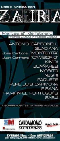 Así han llamado al homenaje que el próximo martes le realizan a Zaira, un activista del mundo flamenco madrileño de los años 90. Artistas como Montoyita, Guadiana, Ramón El Portugués, Juañares, Negri, Paquete… incluso creemos que Diego el Cigala pasarán por la sala Cardamomo a rendir homenaje en una noche mágica… esperemos.