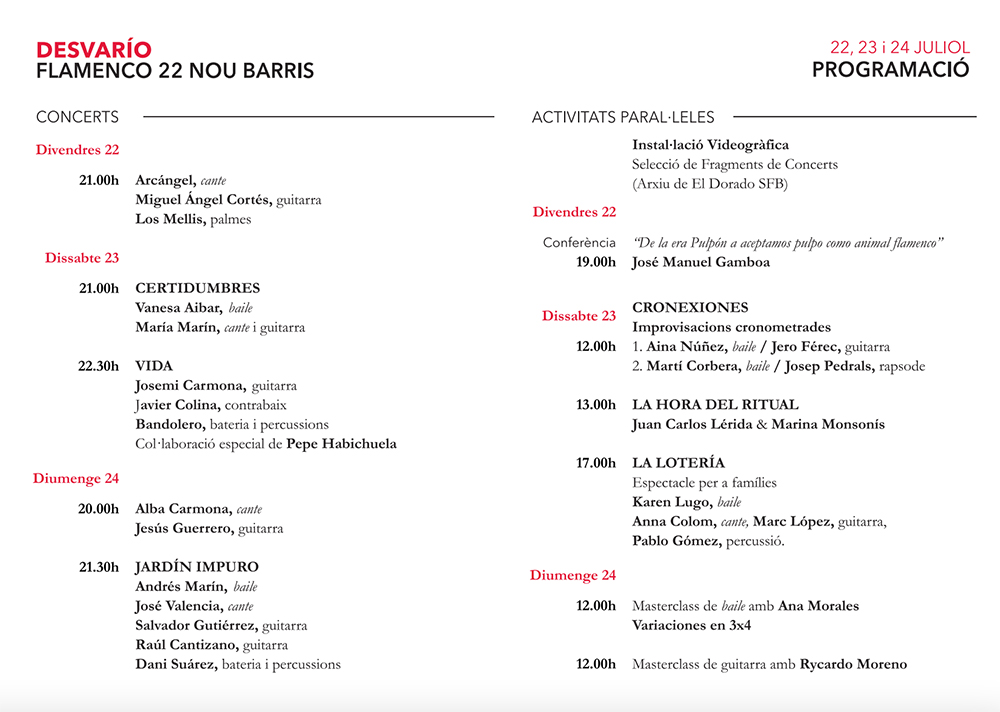 Este año, “Desvarío” tendrá lugar el 22, 23 y 24 de julio. Por primera vez, parte de la programación se integrará en el Grec, el festival de verano de la ciudad, que se celebrará del 29 de junio al 31 de julio. Organizado por la Sociedad Flamenca El Dorado.