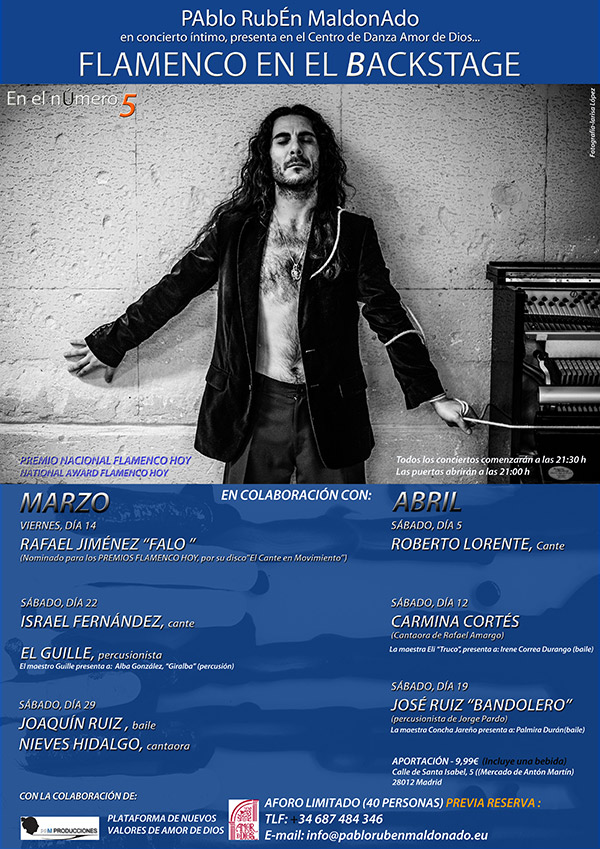 Bajo el nombre de Flamenco en el Backstage, Pablo Rubén Maldonado nos propone conciertos en formato íntimo, no puede ser de otra forma, porque el lugar elegido es una de las aulas de los estudios de Amor de Dios.