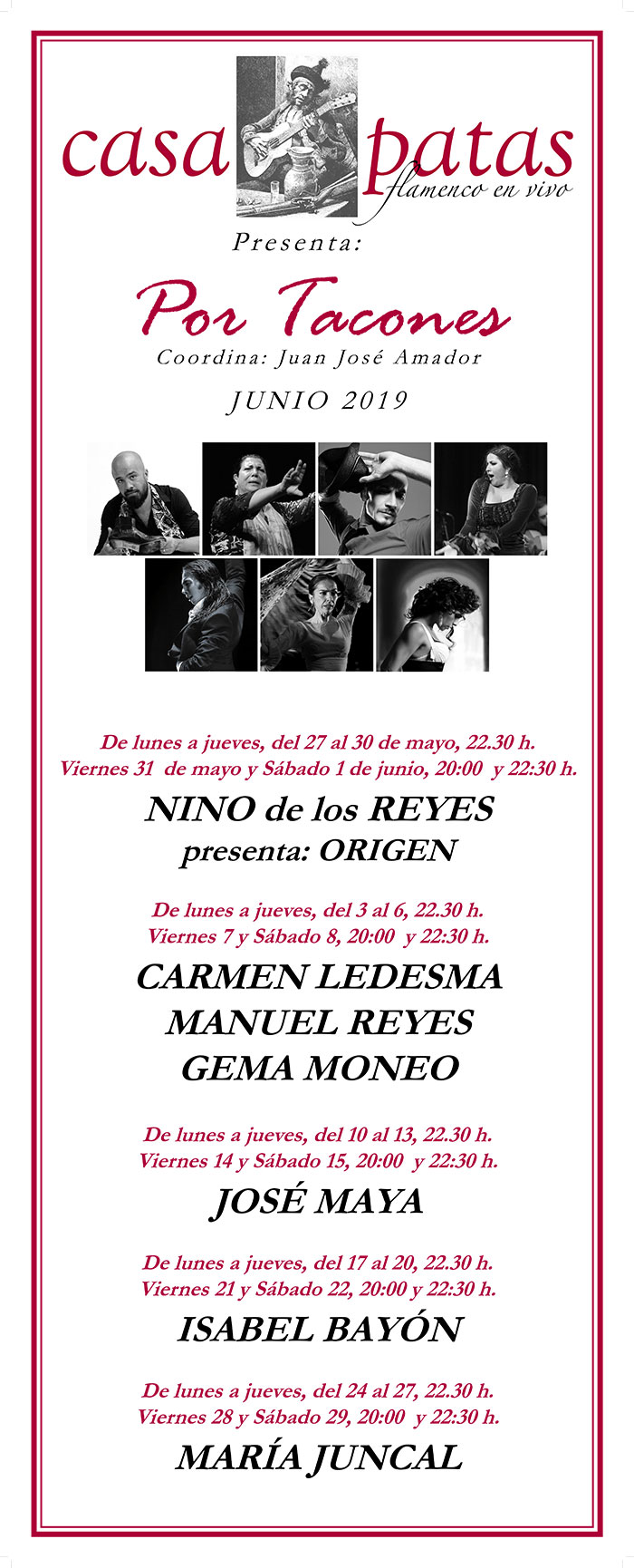El tablao flamenco Casa Patas de Madrid celebra este mes de junio el ciclo “Por Tacones” con artistas de la talla de Nino de los Reyes, Carmen Ledesma, Manuel Reyes, Gema Moneo, José Maya, Isabel Bayón y María Juncal.