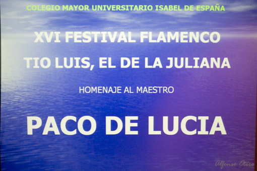 La guitarra en concierto de Serranito, cerró la última jornada del festival, dedicada a la figura de Paco de Lucía, con la presencia de su hijo, Curro Sánchez, y la proyección de imágenes del maestro, el Director del Colegio Mayor, D. Nicanor Gómez entregó a título póstumo el Premio Tio Luis, El de la Juliana a Paco de Lucía.
