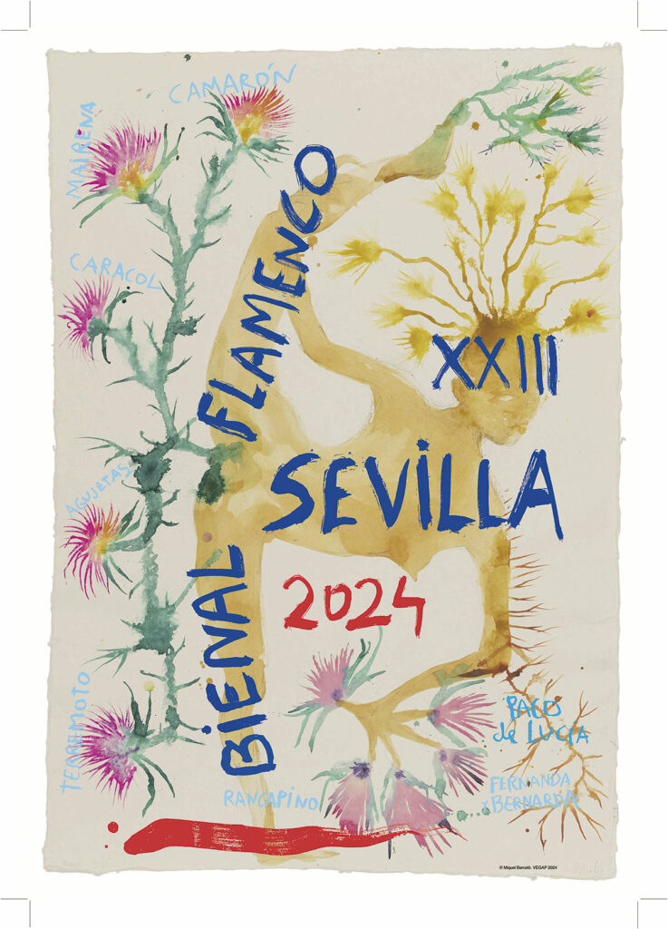 El cartel de la XXIII Bienal de Flamenco en Sevilla, concebido por Miquel Barceló, irradia una vibrante obra en tonos pasteles, donde una mujer danzante se fusiona con motivos botánicos, resaltando nombres emblemáticos del flamenco como Camarón, Caracol y Paco de Lucía. Presentado por el alcalde de Sevilla José Luis Sanz en un evento con notables figuras del flamenco, la pieza captura la esencia de este arte con colores naturales y la incorporación de referencias destacadas.