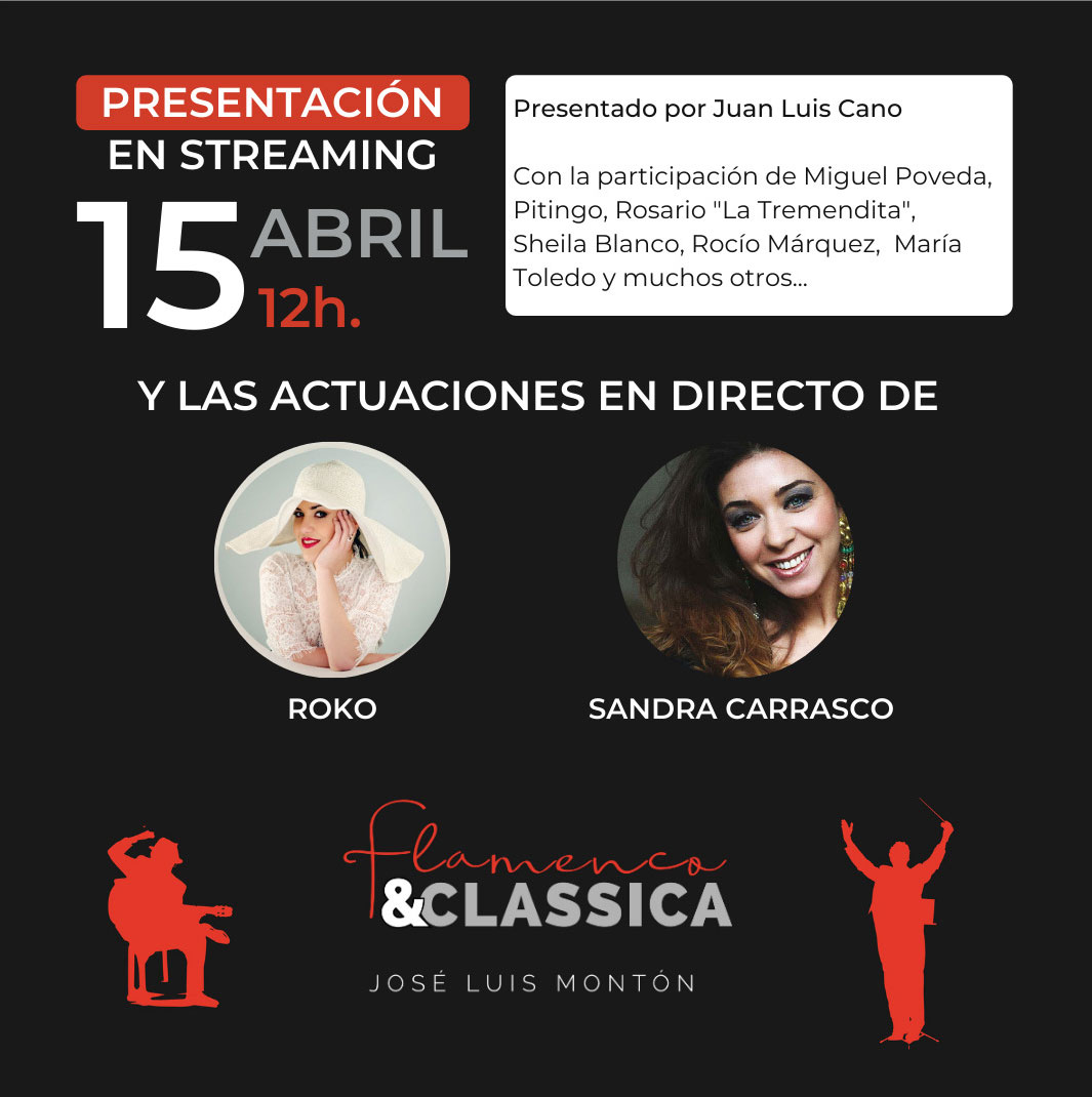 Presentado por el carismático periodista y amante del flamenco JUAN LUIS CANO, contará con la presencia del guitarrista y compositor JOSÉ LUIS MONTÓN, acompañado de las cantaoras SANDRA CARRASCO y ROKO, quienes interpretarán en directo sus respectivos temas del disco Respírame y Prepárate pa cambiar. Sonará también en vivo Tocata flamenca, tema instrumental de los músicos JUAN CARLOS ARACIL y ODEI LIZASO. Las artistas SHEILA BLANCO, ROSARIO ‘LA TREMENDITA’ y MARÍA TOLEDO intervendrán por streaming en la presentación, en la que escucharemos también los testimonios de los otros tres grandes cantaores que ponen voz a Flamenco & Classica: MIGUEL POVEDA, PITINGO y ROCÍO MÁRQUEZ. Como muestra de apoyo y admiración a José Luis Montón, importantes figuras del flamenco que han formado parte de su espectacular trayectoria han querido participar con sus comentarios sobre el disco a través de vídeo-mensajes: CARMEN LINARES, ARA MALIKIAN, ANTONIO NAJARRO, VÍCTOR MONGE ‘SERRANITO’, JAVIER RUIBAL y LOS REPUTADOS CRÍTICOS DE FLAMENCO JOSÉ MANUEL GAMBOA y JOSÉ MARÍA VELÁZQUEZ-GAZTELU.