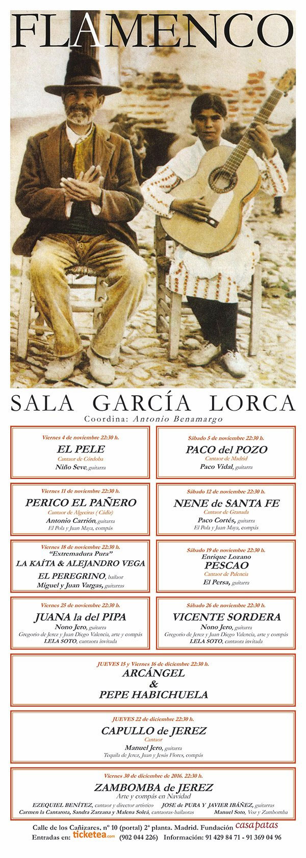 Ya en la cuarta temporada de la Sala García Lorca, bajo la dirección artística de Flamenco de Hoy (Antonio Benamargo) y gestionada por la Fundación Conservatorio Flamenco Casa Patas, contará con artistas flamencos de renombre como El Pele que abre ciclo este viernes 4 de noviembre y por el que pasarán artistas de Madrid como Paco del Pozo -sábado 5 noviembre-, Perico el Pañero de Algeciras, Nene de Santa Fé (Granada), una buena representación de Extremadura con La Kaíta, Alejandro Vega y el Peregrino – 18 noviembre-, un artista de Palencia de reconocido prestigio Enrique Lozano PESCAO -19 noviembre-. De Huelva, el cantaor Arcángel pasará dos noches 15 y 16 de diciembre con la guitarra del maestro Pepe Habichuela, encuentros que pasaran a la historia de la García Lorca y quedarán en la memoria de los privilegiados que puedan conseguir las 90 entradas de cada uno de los días. Recuerden que ahí, el cante es al natural, no hay micrófonos, no hay altavoces, y se escucha de maravilla.