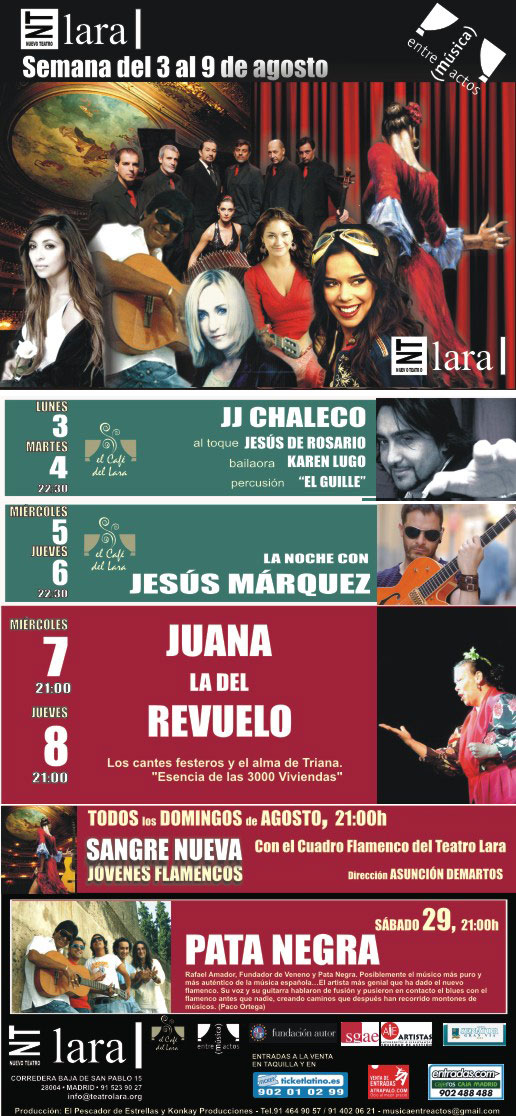 Durante el mes de agosto, el Teatro Lara nos oferta nuevamente una excelente programación, dentro del ciclo MUSICA ENTRE ACTOS o en EL CAFÉ DEL LARA, los aficionados que se acerquen por la capital tendrán la oportunidad de disfrutar de artistas que dificilmente se pueden ver en Madrid.