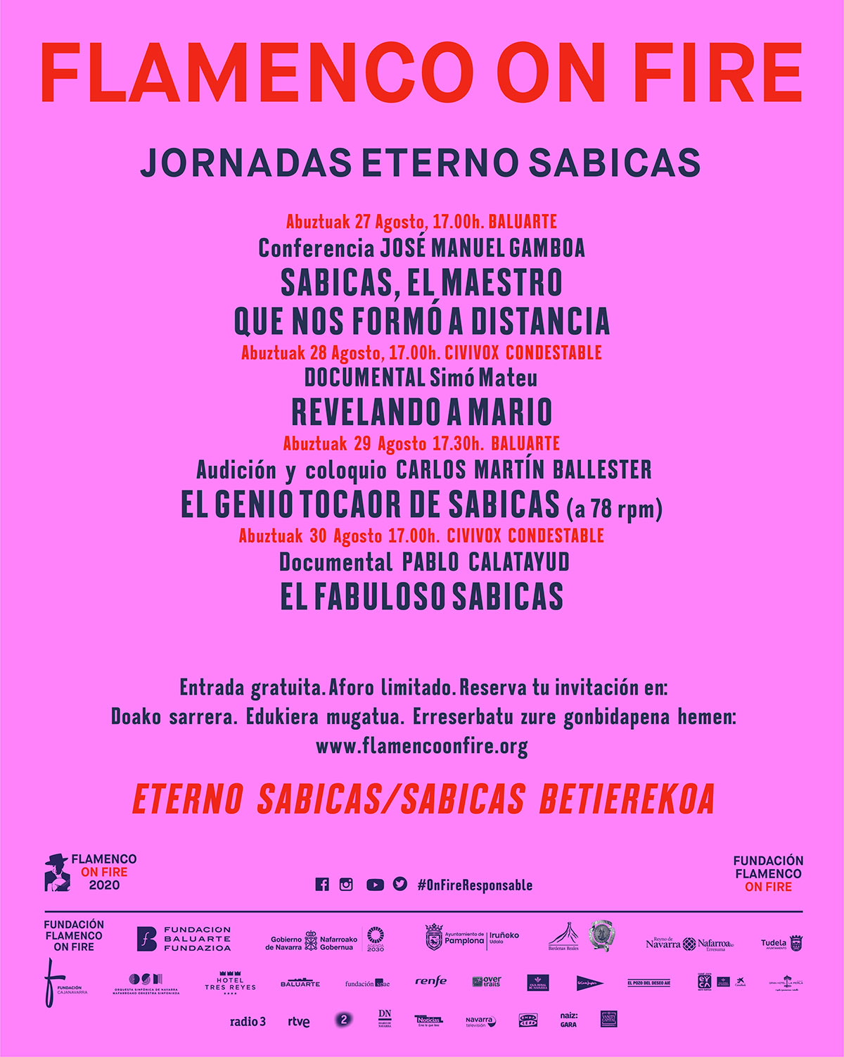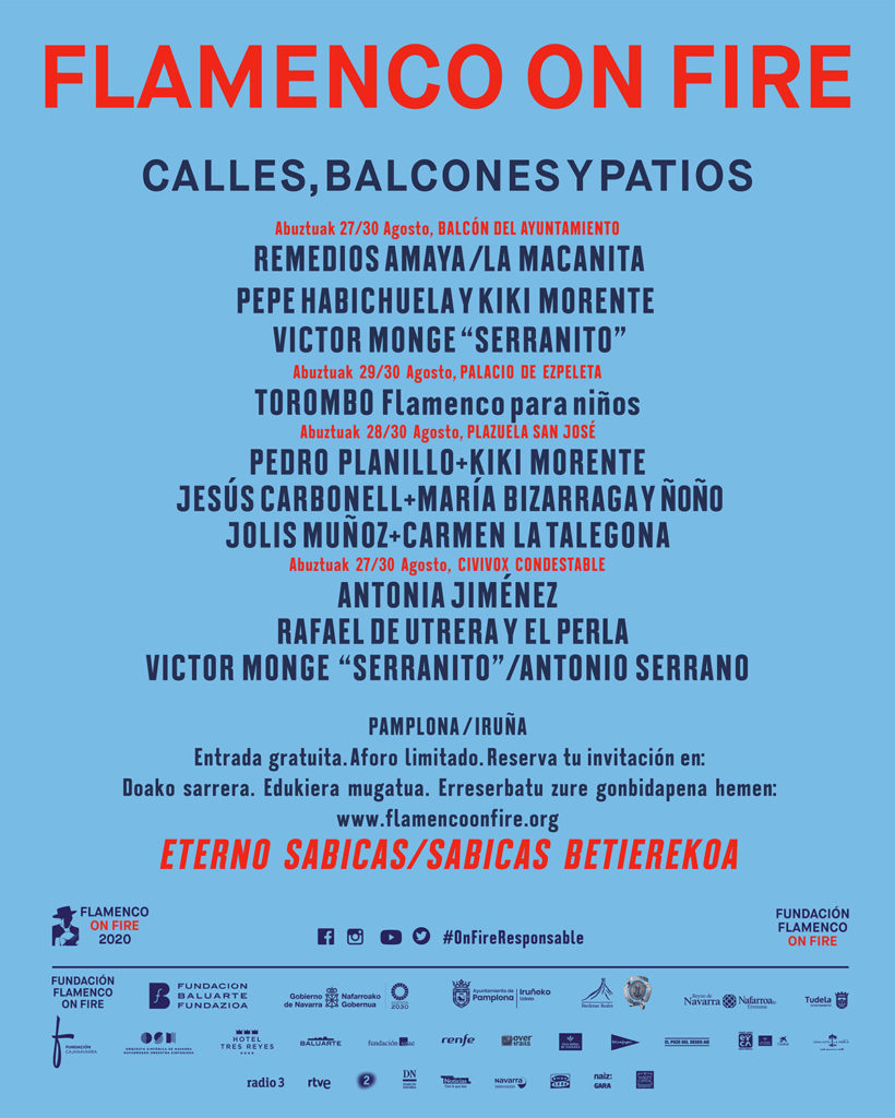 La VII edición de Flamenco on Fire 2020 abre hoy el proceso de adquisición de entradas para sus conciertos y actividades gratuitas. Como cada año, el festival ofrece de manera gratuita una amplia muestra de las mejores propuestas del Arte Flamenco actual en lugares emblemáticos de Tudela y Pamplona , así como distintas actividades, conferencias y proyección de documentales destinadas a promover su conocimiento y difusión. Las entradas para los ciclos Calles, Balcones y Patios, F de on Fire y Jornadas Eterno Sabicas se podrá solicitar a través de www.flamencoonfire.org hasta agotar los aforos establecidos por el festival y su adquisición estará limitada a dos entradas por persona.