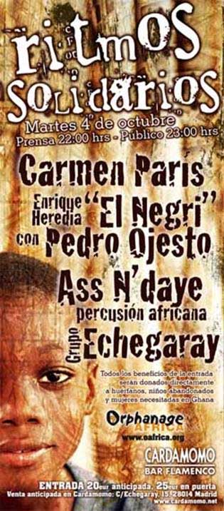 El 4 de octubre artistas de la escena madrileña tan importantes como Enrique Heredia Negri, estrenando nuevo disco, junto a Pedro Ojesto, Carmen Paris, el grupo de percusión africana Ass N'dave y el grupo Echegaray ofrecerán un concierto solidario de la ONG Orphanage. Ritmos solidarios, ritmos del mundo