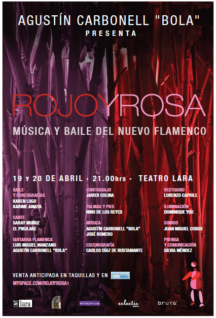 Rojo y Rosa tiene Flamenco, Clásico, Jazz… que cuenta al baile con Karen Lugo y Karime Amaya, la primera con un estilo vanguardista, lleno de una estética y belleza especial; Al contrabajo, el internacionalmente reconocido Javier Colina, uno de los mejores de la escena europea y pilar del A las guitarras, Agustín Carbonell “Bola” y el joven talento Luis Miguel Manzano. Vestuario diseñado por el genial Lorenzo Caprile. Sonido, Juan Miguel Cobos. Creación de escenografía, Carlos Díaz |