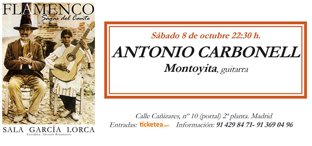 Este próximo sábado 8 de octubre en la Sala García Lorca llega el turno del cantaor Antonio Carbonell, acompañado a la guitarra por su hermano Pepe Montoyita.