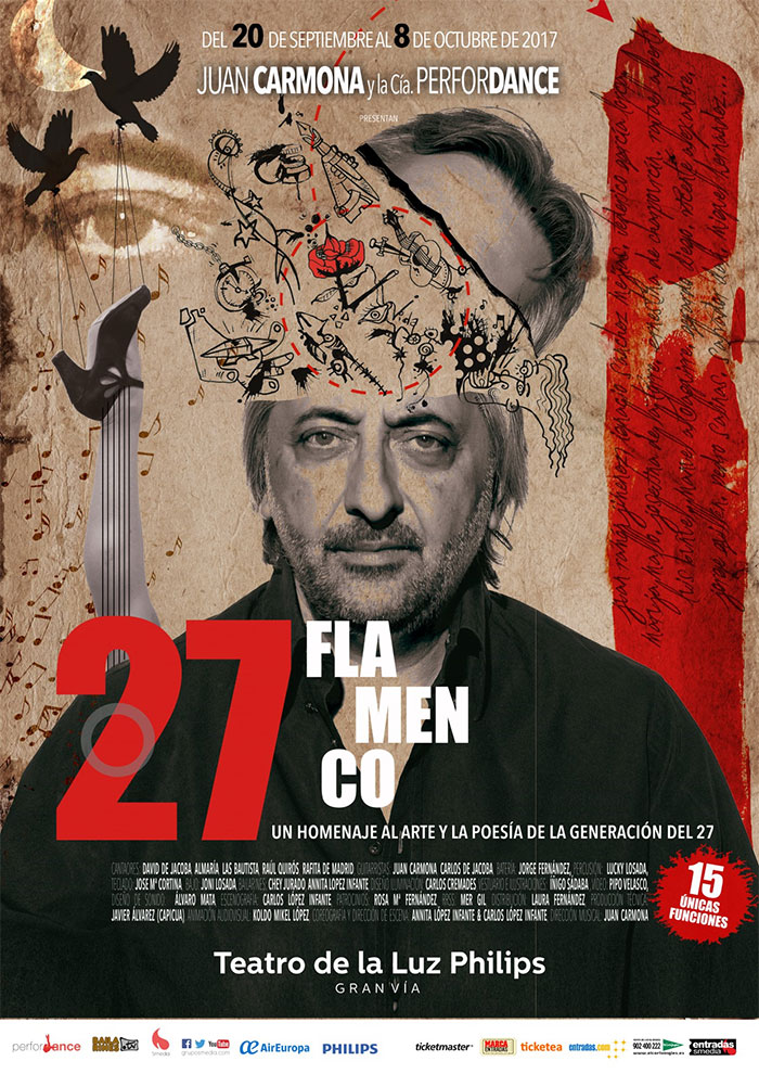 27 FLAMENCO, es una propuesta escénica, musical y coreográfica que rinde homenaje desde el flamenco a una selección de autores de la prolija generación 27. Creada desde un esmerado tratamiento musical e interpretado por una selección de figuras emergentes del panorama flamenco capitaneados por Juan Carmona.