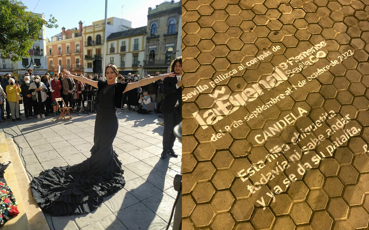 Con la presentación del cartel de La Bienal de Flamenco el pasado viernes 17 de diciembre, se presentó el programa ‘Alumbra’ con a intervención artística ‘Soleares de paso’ que invita a los sevillanos a pasear al compás del 3×4 con letras escritas por la poeta Carmen Camacho y que se expanden por toda la ciudad.