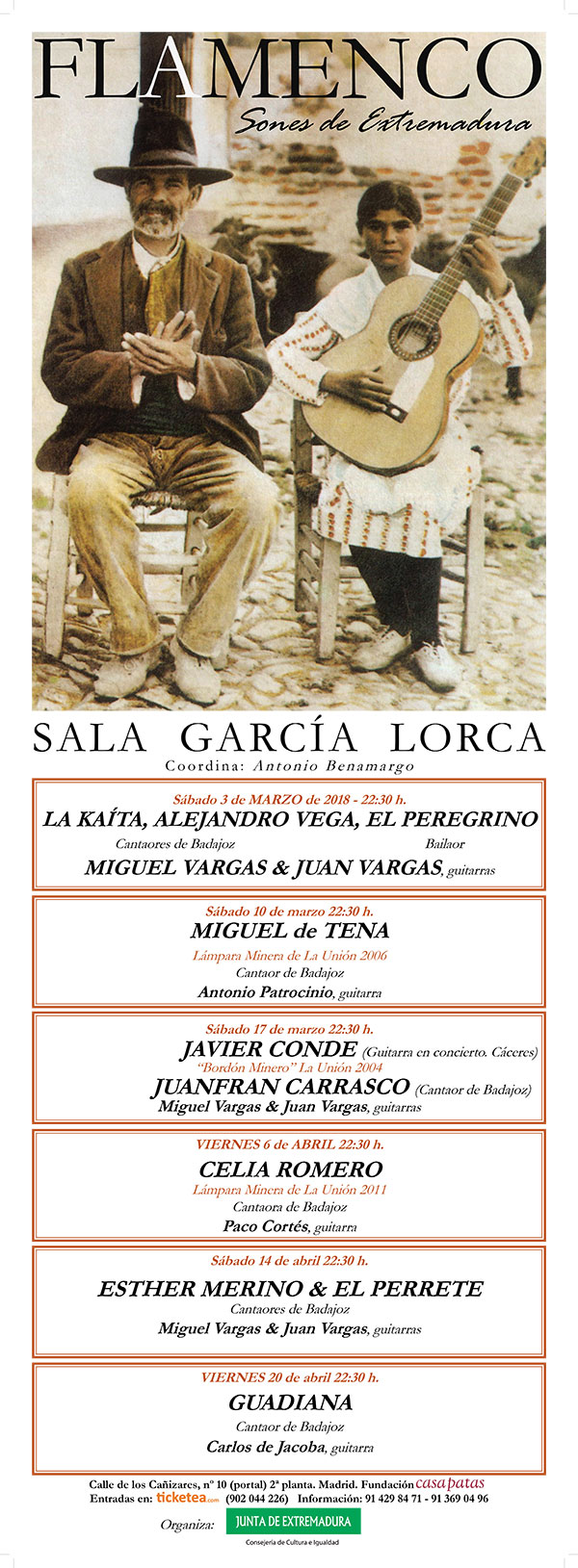 El ciclo lo abren el sábado 3 de marzo, los integrantes de Extremadura Pura, que traerán el cante con La Kaita y Alejandro Vega, el toque del padre e hijo, Miguel Vargas y Juan Vargas, con el baile del genuino El Peregrino.