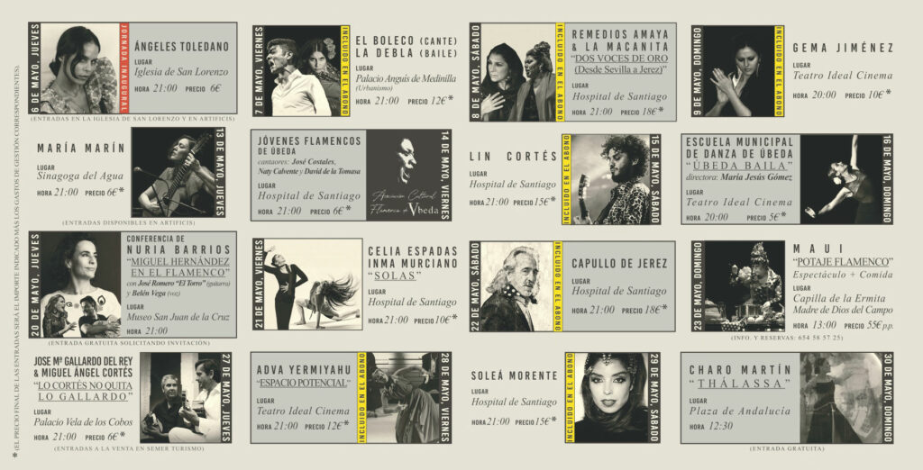 “Flamencos y Mestizos” es un festival ideado y dirigido por Paco Ortega y organizado por la Concejalía de Cultura, Turismo y Patrimonio del Ayto. de Úbeda, que ofrece una ventana a los artistas que se mueven entre el flamenco más clásico y las propuestas más novedosas y emergentes. Un abanico extenso que permite que convivan en la programación artistas como Remedios Amaya, La Macanita, Capullo de Jerez, Soleá Morente, Lin Cortés, Maui, José Mª Gallardo del Rey, Miguel A. Cortés, Adva Yermiyahu, Ángeles Toledano, El Boleco, La Debla, Gema Jiménez, María Marín, Celia Espadas e Inma Murciano, Nuria Barrios, Charo Martín, entre otros muchos!