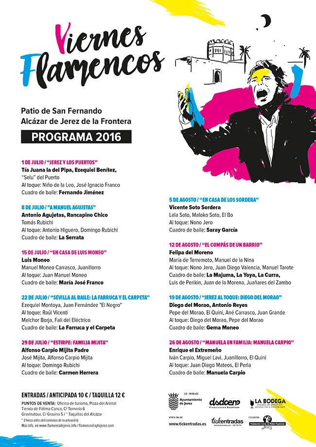Se celebrarán en el patio de San Fernando del Alcázar de Jerez a las diez de la noche, con un precio de la entrada de 10 euros en venta anticipada y de 12 en taquilla el día del evento. Las citas de los viernes se dedicarán a ‘Jerez y los puertos’; ‘A Manuel Agujetas’; ‘En casa de Luis Moneo’ ; “Sevilla al Baile: la Farruca y El Carpeta”; “Estirpe. Familia Mijita”; “En casa de los Sordera”; “El compás de un barrio”; “Jerez al toque. Diego del Morao” y “Manuela en familia. Manuela Carpio”.