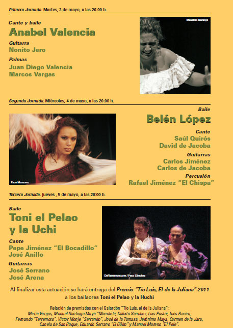 La programación, compensada, una oportunidad para jóvenes que quieren reivindicarse como la cantaora lebrijana Anabel Valencia y la bailaora tarraconense Belén López; el reconocimiento a los maestros, en esta edición para Toni el Pelao y La Uchi que reciben el premio 'Tío Luis, El de la Juliana». También este festival es una oportunidad para los aficionados, para ver el flamenco poco habitual en los escenarios habituales de la capital. A buen seguro, latente quedará durante el Festival, el recuerdo por parte de los aficionados asistentes y artistas a la figura de Ángel Lacalle en esta su última programación a título póstumo. Colegio Mayor Universitario Entrada gratuita |