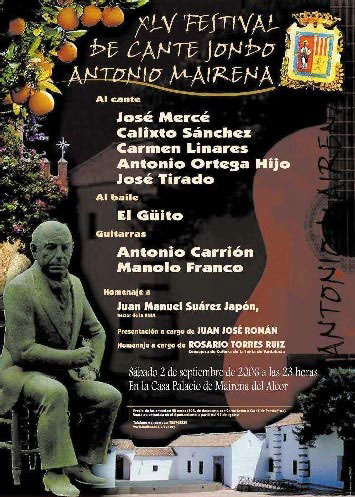El sábado, 2 de septiembre, se celebra en Mairena del Alcor el cuadragésimo quinto Festival de Cante Jondo «Antonio Mairena». Después de tres jornadas de estudios dedicadas a la figura de Enrique el Mellizo cuyo centenario se está recordando a lo largo del año, con la participación de conferenciantes como Manuel Martín Martín, Ramón Soler o Antonio Benítez, llegará la noche del cante con uno de los más antiguos festivales.