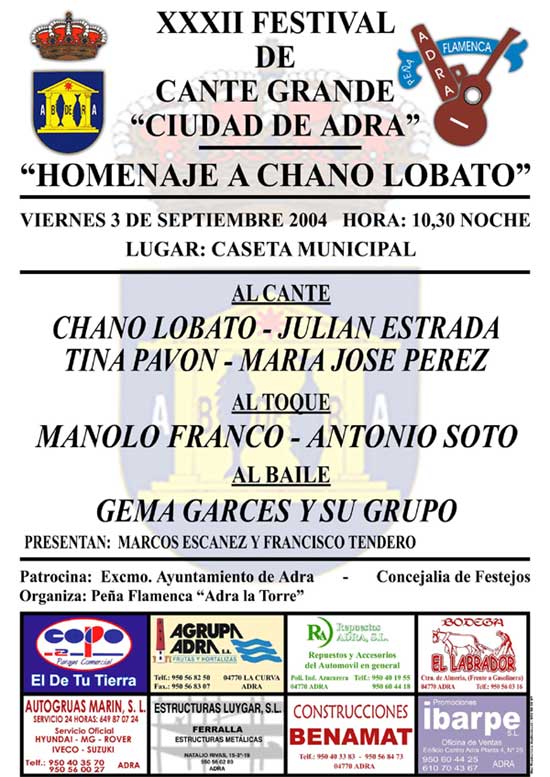 El Viernes 3 de septiembre a las 10:30 de la noche se celebra en 'Homenaje a Chano Lobato' y contará con la presencia del maestro y el cantaor Julian Estrada y la joven cantaora almeriense María José Pérez