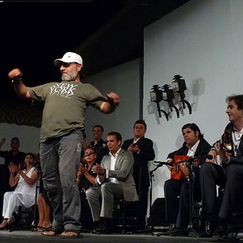 Manuela Carrasco has been gracing the stage of this festival for decades. Her backup of ten men maintained the energy that enveloped the dancer at every moment; the excellent voices of Enrique el Extremeño, Rubio de Pruna and Emilio Molina, guitarists Joaquín Amador and Paco Iglesias, José Carrasco on cajón, a very attractive and well-disciplined trio of male dancers, Oscar de los Reyes, Rafael del Carmen and el Choro, and Bobote for good measure. The controlled hell-raising to the pulsing ‘romance’ rhythm serves as presentation and appetite-opener, and Manuela the goddess appears swathed in her immense shawl, elements which never vary because they work again and again; great artists manage to make everything seem like the first time. A caña danced by the three men came off a bit retro; group choreographies in flamenco are hard to sell as art, and the audience didn’t get it. Fandangos de Huelva and Manuela’s famous soleá was the dramatic finish. José Menese. The master of ceremonies cited the well-known phrase: “if Menese didn’t exist, they’d have to invent him”, and the patriarch of La Puebla flamenco, so well-loved by his people, took the stage, albeit with diminished faculties, but bravely defending his classic repertoire. He spoke at length, visibly moved, about the passing of Enrique de Melchor before launching into taranto, farruca, tientos, soleá and cabales, the latter sung as an independent cante, although siguiriyas and toná liviana were also thrown in…this singer knows his cante. Most surprising was the inexplicable lack of communication between Menese and Pepe Habichuela who accompanied him. The tonás facing-off was easily “won” by the men on this occasion, followed by the bulerías finale and all the while Diego Clavel’s absence was felt.