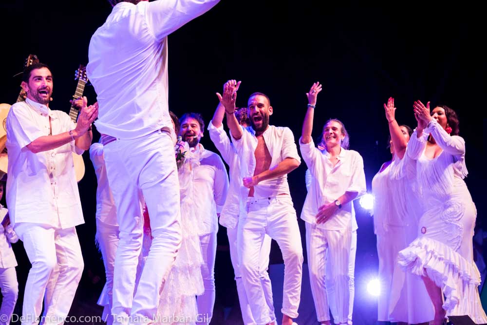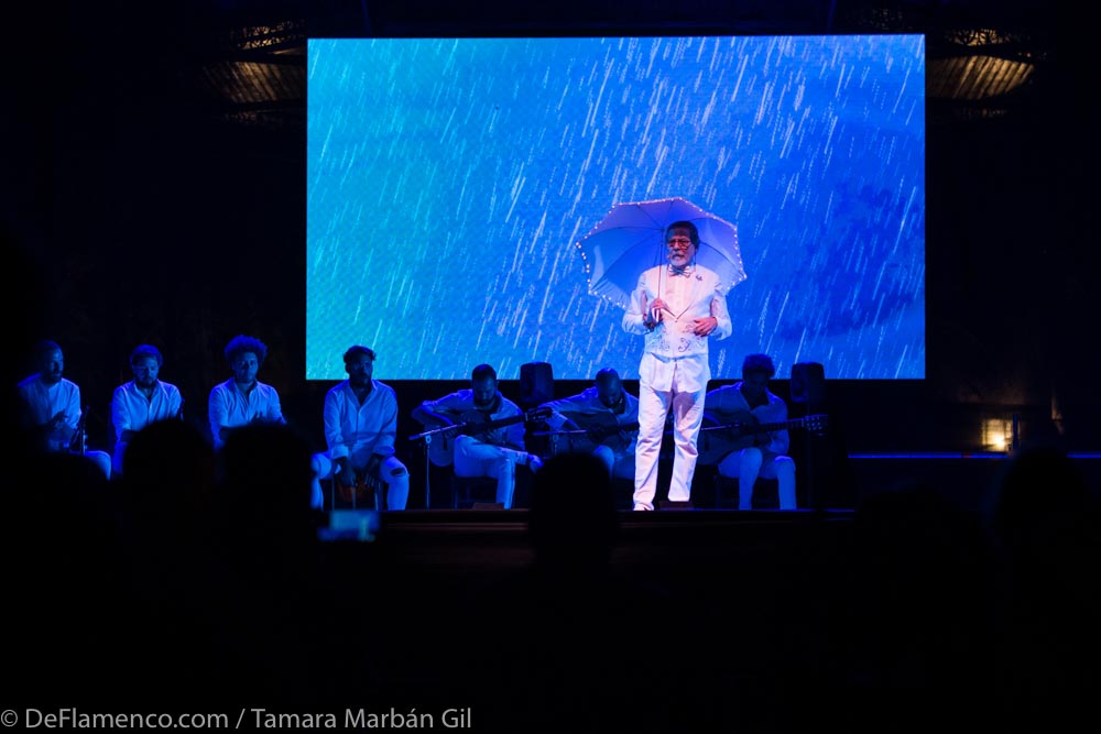 Contribuyó a que fuera una noche para celebrar la blancura en la vestimenta que unificaba todo; un Diego Carrasco espléndido en eso tan difícil de describir y que poca gente sabe hacer como señalar con movimientos de hombro lo importante, subrayar con dos metáforas la honra del caudal (se acordó de Anica la Piriñaca, de María Soleá, de la Tía María Bala, de La Bolola, de la Tita, Lola, Paquera, La Perla, Bernarda, o Tía Fernanda, “de muchísimas gitanas que han sido capaces de hacer que la bulería tenga nombre de mujer”) y todo con un paraguas encendido y al compás de Manuel de Cantarote y Juan Diego Valencia -un par sin igual-, Juan Grande y las guitarras de Nono Jero, Curro Carrasco y Fernando Carrasco. Mientras, nadie sabe si el Tato Diego baila o llora, si se moja o s’arrecoge. Nadie sabe nada, pero no se lo pierdan, ni a él ni -menos- a Tomasito. Puede parecer que no, pero hay tanta verdad en su baile de broma, en su cante de estar de tarro que quien lo mira más de un minuto se da cuenta de que este hombre del carrito de lo helados y con cara de circunstancia sabe muy bien lo que hace.