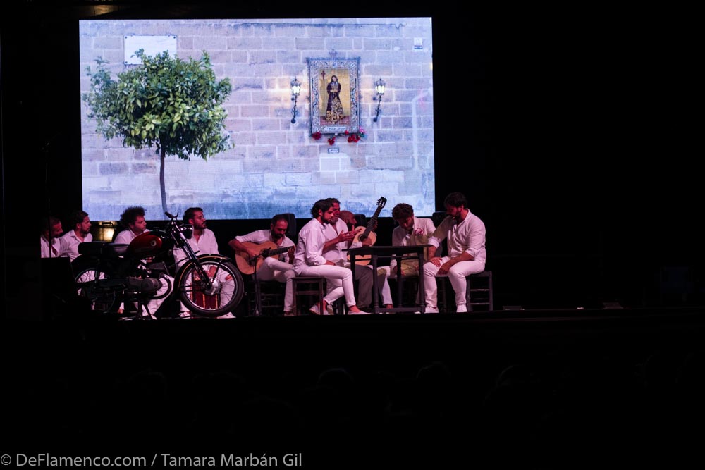 Una de las mejores escenas la protagonizaron José Valencia, Enrique de Remache, Juañares y Maloko en torno a una mesa, compás con los nudillos: en la pantalla, una fotografía en movimiento de la iglesia que guarda al Cristo del Prendimiento (el Cristo de los gitanos de Santiago) con las hojas de los árboles bamboleándose, las vecinas asomándose a la imagen con bolsas de la compra… una ventana a la naturalidad de lo cotidiano. ¡Bravo!) También fue, musicalmente, de las mejores. Lo que no se acabó de entender es qué pintaba aquella moto -anunciada también en la pantalla- allí. Empezaron con romance por cantiñas. Luego soleá ligerita y, después, por alegrías. Brilló para mi gusto, por encima de todos, José Valencia, que juega en una estadio privilegiado de potencia y matices y que tan libre vuela por todos los registros que hasta se cruza por bulerías a conciencia y sale airoso. Más madera: la malagueña de El Mellizo con olor de granaína, soléa, fandango de El Gloria y taranto, uno de los más conocidos de Manuel Torre (el de la espuela).