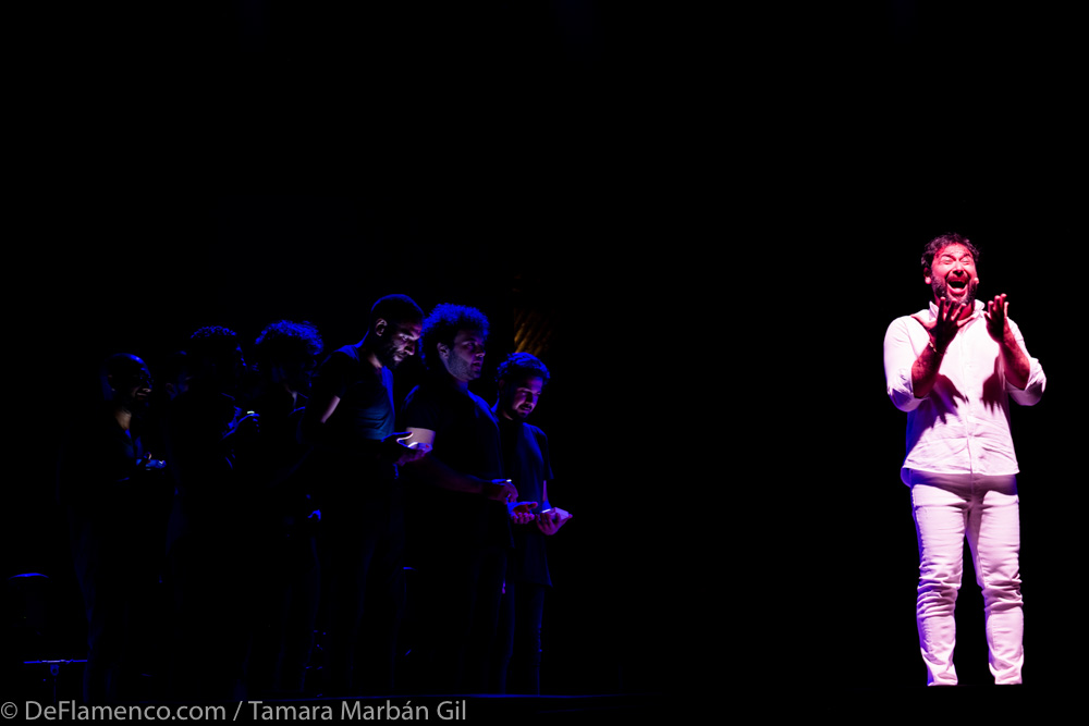 Juan Herrera ordenó también a los reyes del compás como una cuadrilla de costaleros que se mecían, iluminándose cada uno a sí mismo desde abajo, al tempo de saeta por siguiriya (¡más gitano no lo hay!) combinando la dirección en función de la procedencia del cante, de la ronda de tonás y los sones saeteros. Martinete, debla, toná, saeta, siguiriya: Juañares a la derecha, José Valencia a la izquierda y un Agujetas Chico que dejó un sello personalísimo tanto en su dúo con Sorderita (muy, muy bello) como cuando se acompañó por siguiriya él solo, sentado en un cubo de luz. Más joyas visuales que, con mayor indagación y quizá también tiempo, rozarían la factura deliciosa a que apuntan.