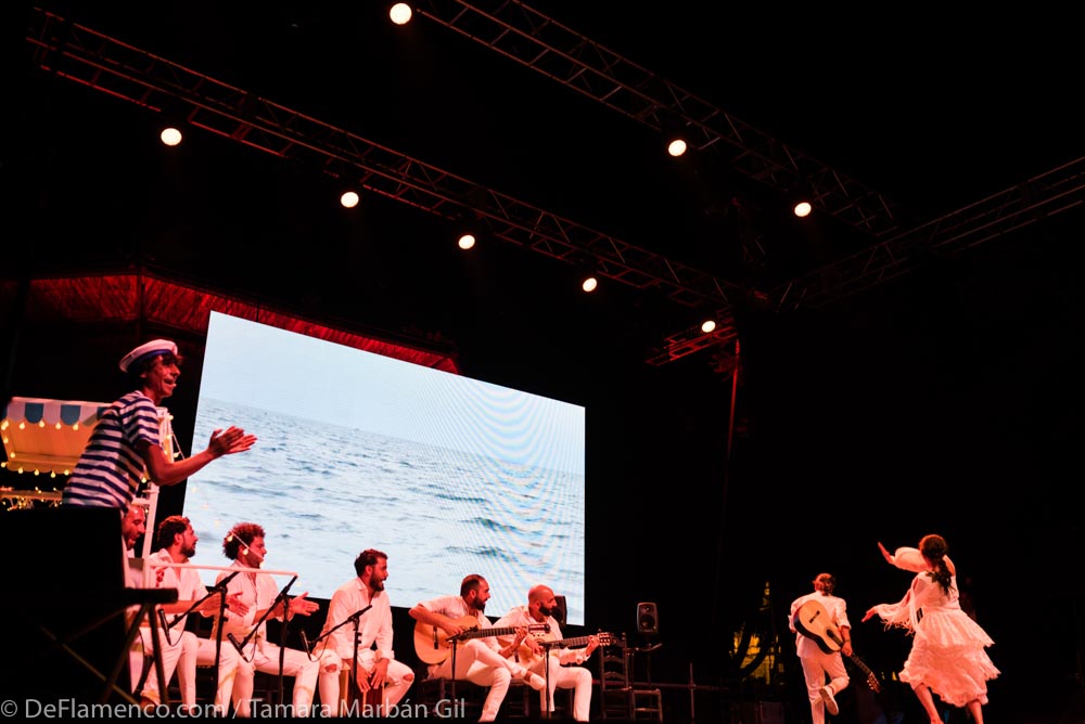 Si la primera noche, como cada año desde que la fiesta dejó de ser un día para englobar tres, está dedicada a la juventud o a salirse del tiesto aunque sea un poco, cómo se salió de la maceta para bien, cómo mandó el barrio de Santiago. Muy significativa fue para ello la presencia en la dirección artística de Juan Herrera, conocido guionista y productor que imprimió al asunto una factura que no suele estar presente en este contexto. Por un lado, tener una causa, un hilo narrativo, en este caso el río de la bulería, donde mana la fuente que nunca termina. La idea de Juan estuvo presente y clara, a nivel visual, en muchas de las escenas que conformaron el show y se sentía la mano experta de quien crea, desde hace años, imaginarios colectivos. Y, por otro lado, lejos de dar por redondo y/o cerrado el espectáculo (que admitiría sin problema bisturí, cierto reordenamiento y pulir algunos efectos técnicos) hubo coherencia visual, musicalidad (soniquetazo liderado por Curro Carrasco, director musical) y algarabía.