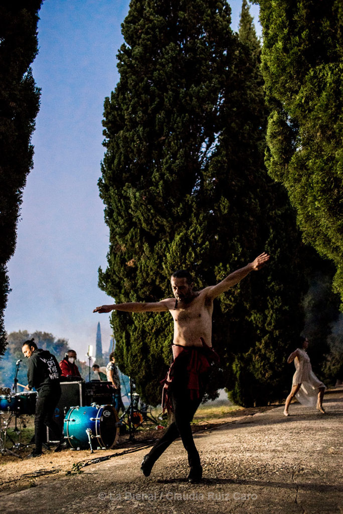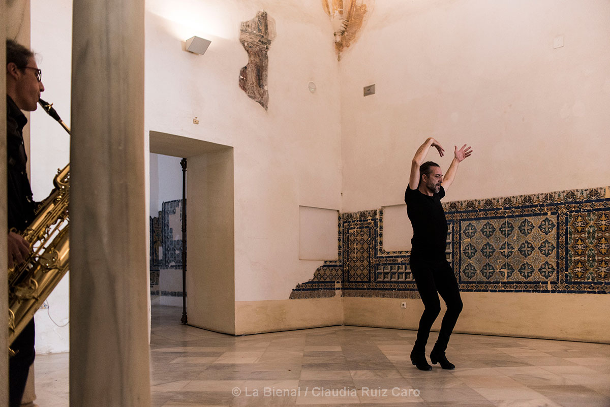 Espectáculo: La vigilia perfecta. Dirección artística, musical y baile: Andrés Marín. Cante: Cristian de Moret. Saxofones: Alfonso Padilla. Percusión flamenca: Daniel Suárez. Marimba y percusión: Curro Escalante. Artista sonoro: Francisco López. Colaboración artística: José Miguel Pereñíguez. Lugar: Monasterio de la Cartuja. Ciclo: XXI Bienal de Flamenco de Sevilla. Fecha: Sábado, 3 de octubre. Aforo: Lleno.