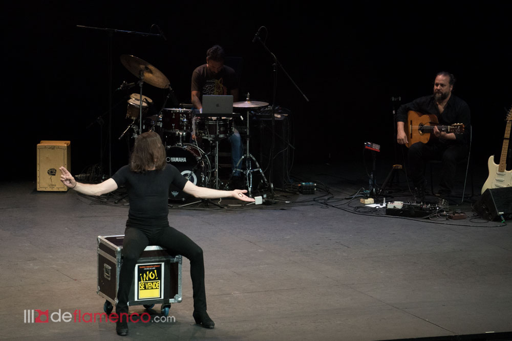 El estreno mundial de “Yo le canto a mi baile” comenzó sin ceremonia, con las luces del teatro encendidas, el bailaor mira al público a los ojos sentado sobre una caja que porta el cartel de “No se vende”. Pocas pistas más hasta que exhala con la respiración entrecortada: “Esto es un marathon” y sentado frente al atril lee un manifiesto:
