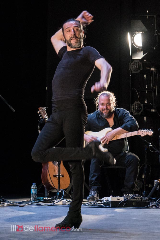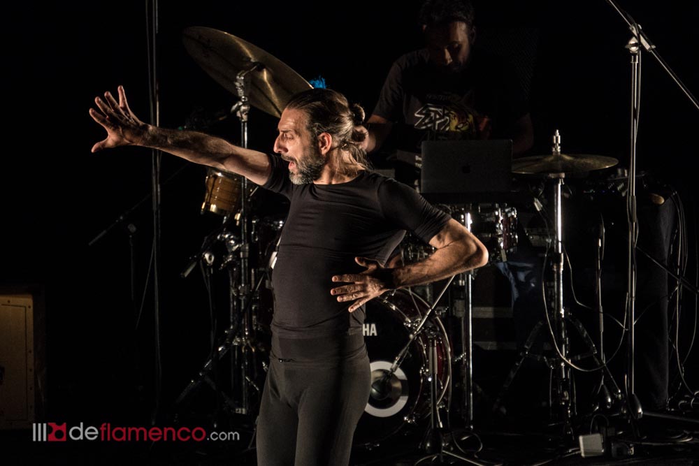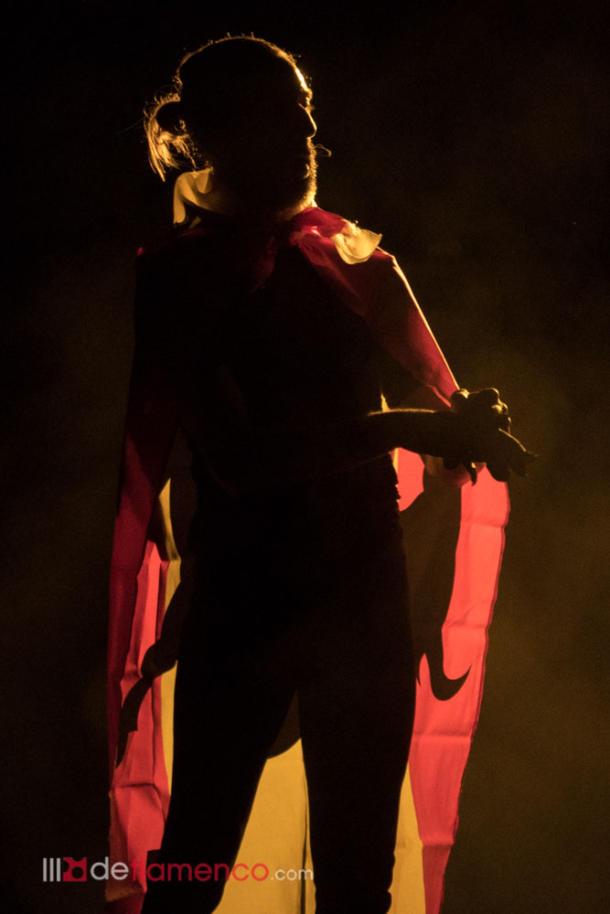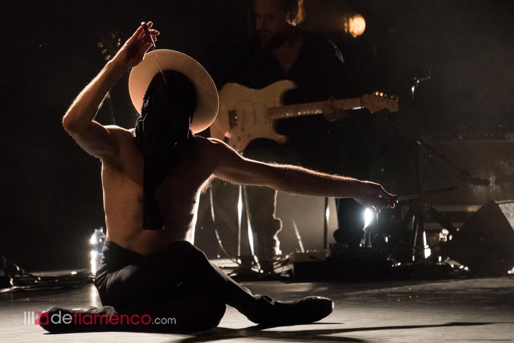 El percusionista se sitúa con su cajón de espaldas al público y nos quedamos con el interrogante; Marín no ofrece más pistas que las reseñadas y Cantizano toca flamenco en contadas ocasiones hasta dar la impresión de que juegan con un puzle en el que se mezclan -como en un sueño- lo flamenco y lo contemporáneo y, a veces, coincide una cosa con la otra y a veces no. Los juegos abstractos y/o surrealistas se suceden en pequeños detalles, unos ojos pintados en las manos, un rostro velado, dos cuchillos. La belleza de la propuesta va ganando al espectador atento y así durante uno de los instantes en los que el bailaor aprovecha para recuperarse de la paliza. Cantizano interpreta un composición como las que tiene en su disco “Mito y Geología del Canti” y cuando la cosa parece que va quedando bonita para el común de los mortales (sea flamenco o pelícano) deja tirada la guitarra eléctrica para que Andrés Marín le baile un zapateado a los zumbidos y así la guitarra eléctrica pasa de instrumento a cachivache.