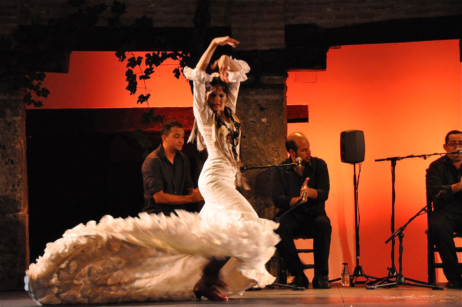 El cante lo pusieron Moi de Morón y Trini de la Isla. Y a destacar la guitarra de Miguel Pérez. No lo conocía pero impresiona la fuerza de su pulgar y la forma de tratar el mástil. Sonando a clásico utiliza y desarrolla las armonías con una facilidad pasmosa. De la malagueña popularizada por Manuel Torre en la voz de Moi al estilo gaditano del Mellizo vocalizada por Trini de la Isla y entran las alegrías. Con bata de cola, el dominio eficaz de ésta es indiscutible. Es un paso a dos entre ella y su extensión de volantes.