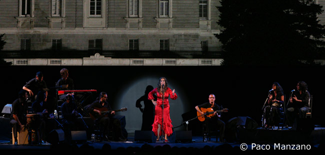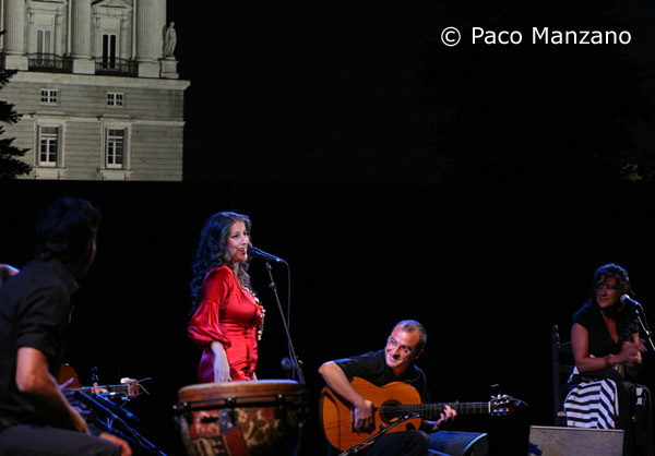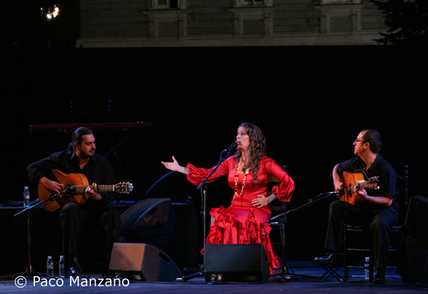 Cante: Argentina. Guitar: José Quevedo “Bolita”, Paco Iglesias. Bass: Popo. Keyboard: Alex Romero. Percussion: José Carrasco. Palmas: Bobote and Torombo. Chorus: Toñi and Victor Carrasco Text: Rubén Gutierrez A MIDSUMMER NIGHT’S DREAM Human beings have always wanted to commemorate heroic deeds with obelisks, triumphant arches, sumptuous palaces and amazing gardens. But a young girl from Huelva had only to appear before an audience with her velvety voice to demonstrate what’s behind her promising career. Argentina won over the ears and hearts of summertime flamenco fans in the capital, and by the walls of the Royal Palace she reaffirmed her candidacy for a flamenco throne she will one day surely occupy. The pleasant evening was the guest of honor, like in a Shakespearian play, and it was the best atmosphere for enjoying cante. Nowadays it’s hard to surprise anyone, what with the overload of information our senses process every day, but I have to admit, when you go to a festival for the first time, it produces a certain excitement. None of the spectators was disappointed, because Argentina earned her place on a program where most of the other artists are twice her age. The young singer faced the Madrid audience months ago at the Colegio Mayor San Juan Evangelista where she made a good impression. But on this occasion she decided to offer the audience a show she has been taking around Spain, and came with a varied group of artists from different flamenco towns, to create the best cocktail on a sultry summer night. She came dressed in red to add color to the tangos that opened the recital. Standing in the middle of the stage she interpreted a string of verses, from Granada to Extremadura. The chorus and non-flamenco instruments then left the stage for the singer to give her version of fandangos de Lucena with accompaniment between verdiales and jaleo. Then soleá, with echoes of Alcalá and a wink to Tomás Pavón, and granaína of Chacón accompanied by Bola. The singer’s strong voice took charge of siguiriyas, although I’d preferred it had been without cajón in order to better appreciate her fine sound. One thing in particular about Argentina is her originality. She received her preparation at a school where most students come out sounding like clones, the same verses and styles, even the way they stand on stage, but Argentina has managed to give her own twist and not imitate anyone. If it’s uncommon for a young voice to find a place in the market, even moreso with an original sound, but she’s managing to do it. A rumba instrumental kills time while the singer changes costume, and she returns elegantly dressed in black with a white jacket. From here on she delivers the repertoire from her recording debut, with a series of more modern songs in which the give and take of the guitars and the choruses highlights bulerias, tangos and rumbas. Unfortunatley the endings of the songs weren’t convincing, and tended to be left in the air as the singer prematurely stood up at the end of each one. We also missed Bobote’s and Torombo’s dancing in the final bulerías. Argentina couldn’t overlook Huelva, and the fandangos from her hometown were part of the fiesta finale, without amplification, to evoke melodies from the mountain range of Valverde and Alosno where the best cured ham comes from.