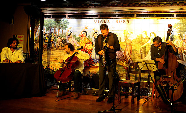 Música que recuerda el aire de audición de alumnos destacados de conservatorio, gente absolutamente volcada en la música, de inefable técnica y vocación clara. Que al salir al escenario dice eso de “y ahora nosotros”. A lo suyo. Con estética entre el jazz tradicional, el postromanticismo clásico, el chill out minimalista y los aires flamencos. Una especie de Dvòrak a la española. El disco tiene siete jugosos y densos temas en los que predomina la estética apuntada y donde el flamenco sólo se intuye en algunos, mientras que en otros es el “jefe”. Como en “Camerata por bulerías”, la “Seguiriya para Astor” con la que cerraron el recital o una interesantísima versión del “Entre dos Aguas” de Paco de Lucía. Interesante por lo atrevido (casi nadie osa tocar temas de otros flamencos), lo avanzado (secciones exprimidas con un gusto soberano) y lo desinhibido de “agregar” al Maestro al repertorio. Camerata además se equilibra muy bien, con el lirismo mayúsculo del violonchelo y el piano, confrontándose con la electricidad de los vientos de Ramiro y, ojito con los amigos, las sorpresivas percusiones de Sampela y el invitado de la noche: Sergey Saprychev, exquisito en el cinco por ocho y seguiriya final. Dará que hablar. Está claro que estos amigos pasan de etiquetas, se juntan para hacer buenísima música y de paso sacan disco. Así debe ser ¿no?