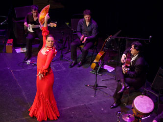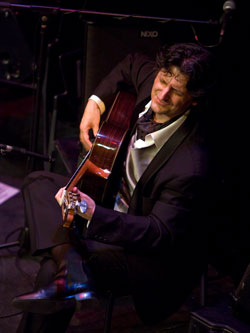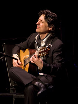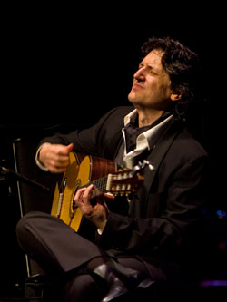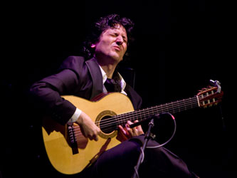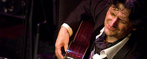 Ficha artística: Guitarra: Juan Manuel Cañizares; Bajo: Íñigo Goldaracena; Percusión: Rafa Villalba; Baile y Castañuela: Charo Espino; Baile y Cajón: Ángel Muñoz. El guitarrista Cañizares abrió el ciclo Jueves Flamencos, patrocinado por Cajasol, con un concierto titulado “Cuerdas al alma”, en él presenta su último trabajo homónimo. La noche estuvo dedicada al pueblo japonés por los lazos familiares que unen a este músico con el país nipón. El recital comenzó con una guitarra que susurra al público “Añorando Presente”, una fantasía que da idea del momento creativo y musical en el que se encuentra el guitarrista. Una música de atmósfera, dulce, rica en sonoridad y en busca de un aire que renueve su sonido, a veces demasiado basado en su gran habilidad para recorrer el mástil a gran velocidad. También de su último disco y más en su onda clásica sonó la Bulería “El Abismo”, picados y armonía moderna, para eso Cañizares es un intelectual del sonido. Sin embargo la excesiva percusión ( dos cajones y tres palmeros ), que además sonaba muy fuerte ensombrecieron y taparon al solista, poniendo la guarnición en el lugar del primer plato. Uno de los estilos que más domina este músico catalán son los tangos, en este compás se encuentra a sus anchas y despliega su técnica con facilidad pasmosa. Aunque demuestra en temas como “Puente Arpegiado” dominar el diapasón, el sonido que propone me parece demasiado vinculado a la obra de Paco de Lucía, un sonido que por muy revolucionario que fue, a día de hoy deja de sorprender e incluso llega a sonar previsible en demasía. En este momento llegó una de sus obras maestras “lluvia de cometas” una rumba de sonido moderno que se encuentra en la ola de sonido flamenco-Jazz que puso de moda el genio de Algeciras. Este fue uno de los mejores momentos de la noche. El bajo del vasco Goldaracena supo mantener el papel asignado aportando sonoridad y melodía a la par que colchón rítmico y armónico con buen gusto. El resto de acompañantes no lograron aportar demasiado al concierto, si acaso restaron protagonismo al solista sin realmente ofrecer algo interesante. La balada “Lejana” fue otro de los temas que sonaron bien y que definen un poco ese sonido incluido en el nuevo álbum del guitarrista que comentábamos al principio de la reseña. De su disco “Punto de Encuentro”, quizás su trabajo más innovador, rememoró “Toca Madera” una rumba a tiempo medio que resume muy bien su virtuoso sello de identidad. Por lo demás: repeticiones de estructuras musicales muy conocidas, solos sobre una misma rueda de acordes, motivos melódicos que suenan una y otra vez, y las manos que pulsan las cuerdas a velocidad de fórmula uno, pero a pesar de tener las “cuerdas del alma” sonando, al menos ayer, no dejaron un mensaje que llegara al alma. |