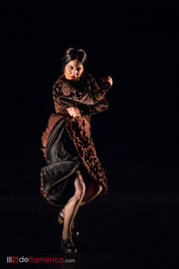 La mujer de espalda es Mercedes de Córdoba que cumple con el papel de ponerse flamenca en ese contexto con la guitarra de Juan Campallo, la percusión de Paco Vega y el cante de David el Galli y Pepe de Pura. Los efectos de luz sirven de transición y vemos a un ser en la penumbra como una estampa de comic. Es una ilusión, Carmen la Talegona dibuja una figura sobre la silla de enea, lleva una chaquetilla en gris metálico que le da un aire a “Mad Max”, la transición la protagonizan los dos cantaores que abandonan el lateral para oficiar de protagonistas. Pepe hace rugir, literalmente, a los espectadores.