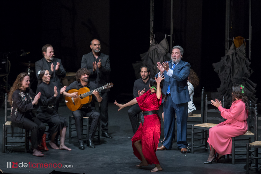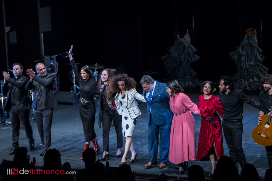 Los vestidos de las bailadoras se han quedado al fondo. Recuperamos la sobriedad y aparece Lucía la Piñona elegantísima en blanco y negro (¡chapeau! al vestuario) y todo avanza para que Rosario Toledo ponga la guinda a un espectáculo brillante y se apagan los aplausos, los olés y los bravos porque aparece Enrique El Extremeño y entona una de trilla y un romance y reaparecen las cinco bailaoras vestidas de calle (y pa matarse desde esos tacones) y se entiende la jugada: esta es la mejor manera de despedirse con una “patá” por bulerías como Dios manda. Lo de los tacones añade el dicho circense de “peligra la vida del artista” y tres de cinco optaron por bailar descalzas. Mención a Pepe de la Pura que se marcó un antológico “compromiso” de Machín y “El Extremeño” que improviso versos para cada bailaora. Luego, el clamor, ¡los oles! y la vuelta al ruedo.