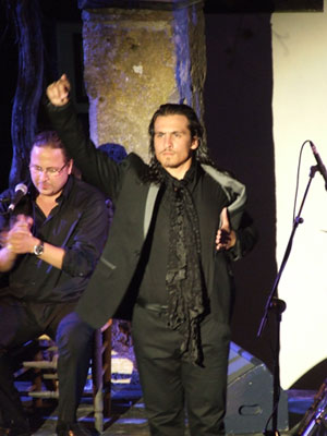 The following night there was a lot of excitement at the entrance. When you see this you always know the person about to perform is either a mediatic personality or a great artist. Or both. Farruquito’s younger brother was back at the Corral after several years absence, and stirring a great deal of expectation to judge from the mass of young girls crowded around the door. Farru is a performer of extremes. He is either well-liked, or not liked at all. His temperamental, electrifying style of dance is his calling card. He began with tangos, long and full of energetic cuts. Antonio Rey, one of the guitarists, offered an imaginative and musically rich guitar solo. The off-stage voice of Farruquito opened the soleá with poetry he himself had written, and the dancing of Polito, another member of the family. The young man began in a restrained but crisp style, and upped the tempo and excitement to the point of excess. Farru appeared on the scene to take over, showing off with each movement, each pose, with all the power that characterizes him, but sacrificing high art for easy applause. The fiesta finale featured Polito and his cousin Barullo, barefoot, and young Carpeta leaving no doubt that the dynasty will continue for some time. Rubio de Pruna carried the weight of the singing magnificently.