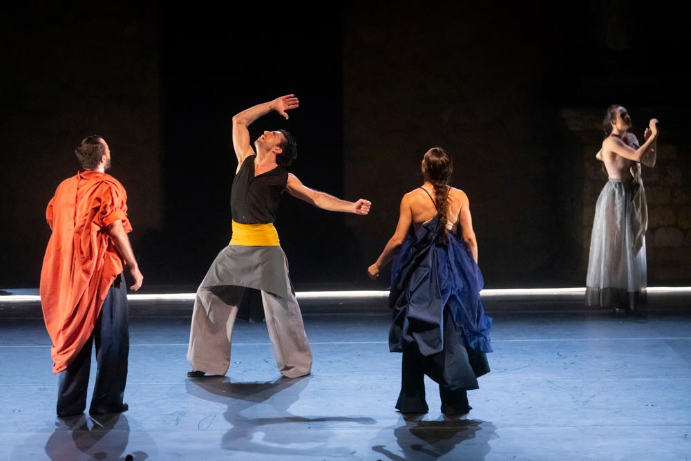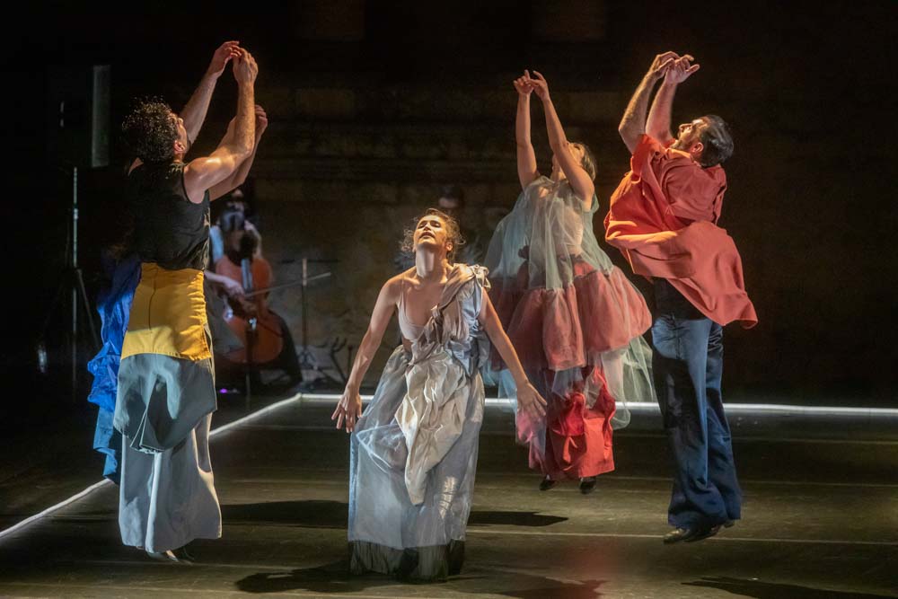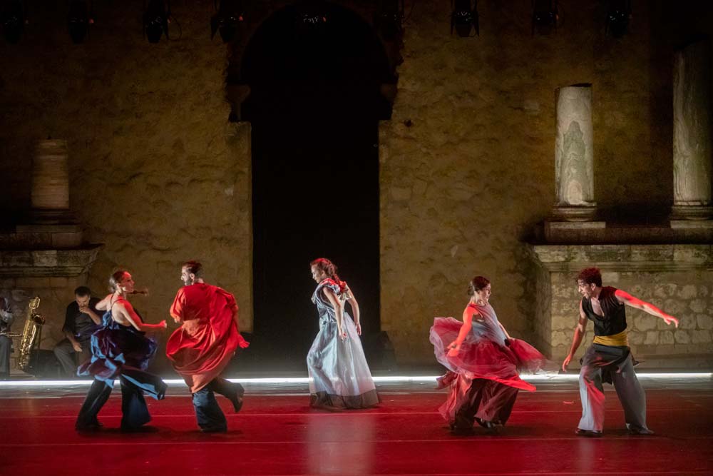 Espectáculo: Los bailes robados. Dirección artística, escena y desarrollo: David Coria. Asesoramiento musical y cante: David Lagos. Coreografía y baile: David Coria, Aitana Rosseau, Florencia Oz, Rafael Ramírez, Marta Gálvez. Cante, música y cello: Isidora O’Ryan. Saxo: Juan M. Jiménez. Colaboración Coreográfica: Eduardo Martínez. Asesoramiento: Daniel Muñoz Patinga. Lugar: Teatro de Itálica. Festival Internacional de Danza. Fecha: Viernes 7 de julio. Aforo: Lleno.