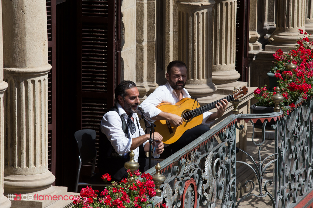 Siguiente parada la plaza del castillo con Duquende que se presenta vestido de rojo y negro ante un sol implacable. En el balcón del al lado el tocaor se las apaña para mantener el espíritu. Imposible comparar con el concierto de la noche anterior, imposible romperse de la misma manera. Muy difícil sentir lo mismo que cuando te pides la primera caña del día.