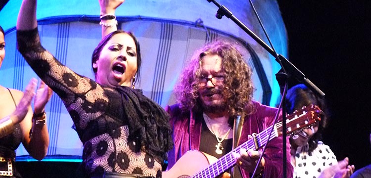 Y Raimundo, hombre… A la primera, si he de decir la verdad, y de eso se trata, la relajada música de blues cayó como un cubo de agua fría después de la energía flamenca de los susodichos. Si la música nos transporta a determinados paisajes, muchos tuvimos la sensación de haber bajado en la estación equivocada. Pero la cosa se enderezó justo a tiempo con ese “Ay José, yo te canto Camarón”, balada definitiva del final de los años ochenta. Todo sobre ruedas a partir de ahí con temas y cantes de variada flamencura, bailecitos, soleá a guitarra eléctrica, vamos, una lección de tolerancia, de que el flamenco surge donde y cuando menos te lo esperas.