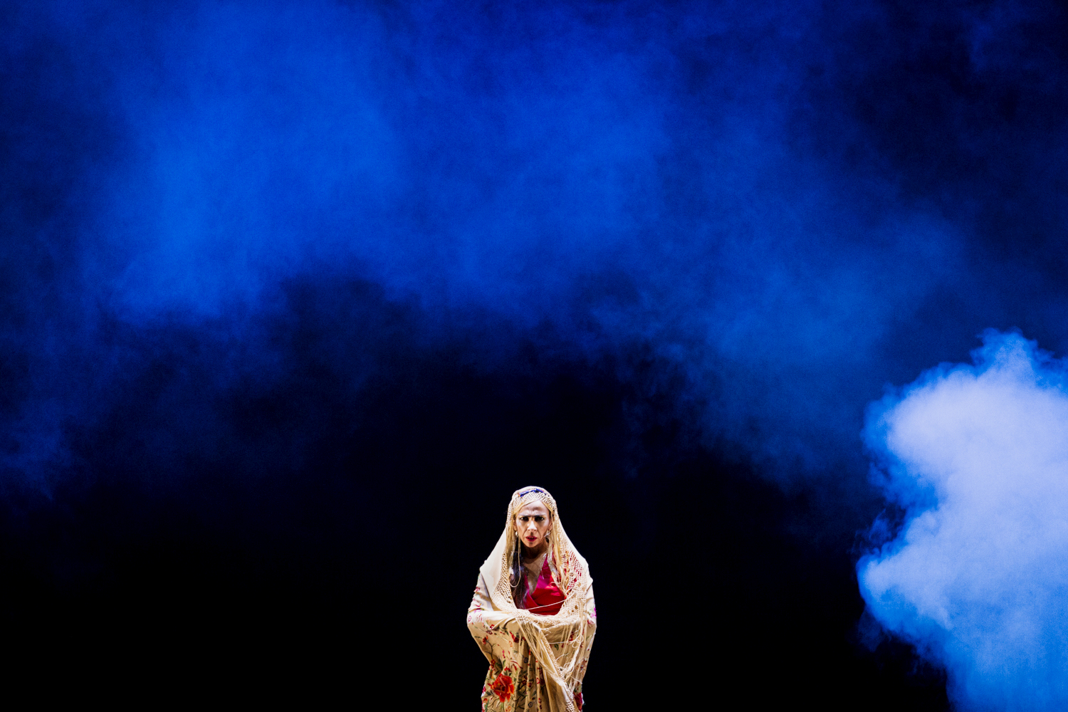 Para explicar lo que se vio en el Maestranza empecemos por partes. De flamenco, nada. De danza, muy poco. Es decir, al contrario de las propuestas de Galván, en la que el flamenco está presente en el tejido de su baile y de su cuerpo, y completamente ajeno al universo al que nos tenía acostumbrados Isabel Bayón –que tanto nos emocionó en la pasada Bienal con su danza en ‘Caprichos del tiempo’, ‘Dju-Dju’ es una acción teatral contemporánea, tragicómica, burlesca, lunática, conceptual y surrealista que, desde luego, difícilmente se digiere en una Bienal. Y, claro, se desató la polémica y el cabreo patente en el patio de butacas entre quienes se iban indignados y pidieron que se les devolviera el dinero de las entradas, los que reclamaban silencio entusiasmados por lo que veían y quienes sin pudor gritaban sentencias del tipo: “el flamenco ha muerto”, “baila un poco, chochete” o, el más sutil, “el que no diga ole que se le seque la yerbabuena”, en alusión a lo que se vitorea en el Falla en Carnaval. Intuimos que nada de lo que no hubieran esperado los protagonistas de antemano.