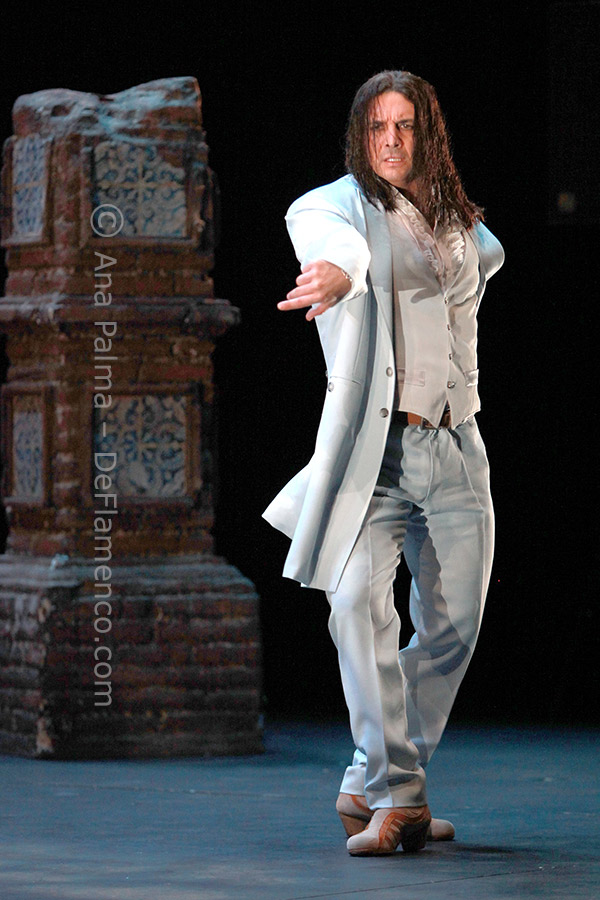Nevertheless, this man is an untapped genius of dance. His use of subtlety to express strength, his physical command; when lesser dancers would pound the floor and jump around, this man manages to transmit his considerable power with the most subtle wrist movement or a tilt of the head. And although he clearly owes a lot to current stars, he has an unmistakable style of his own, a language spoken only by him, but understood by all. And he manages whatever he sets out to do, there are no iffy moments, he never miscalculates. The taste he lacks for mounting a show (his name appears as “artistic director”), is abundantly on-target for his own dancing, always flamenco in the most noble sense of the word.