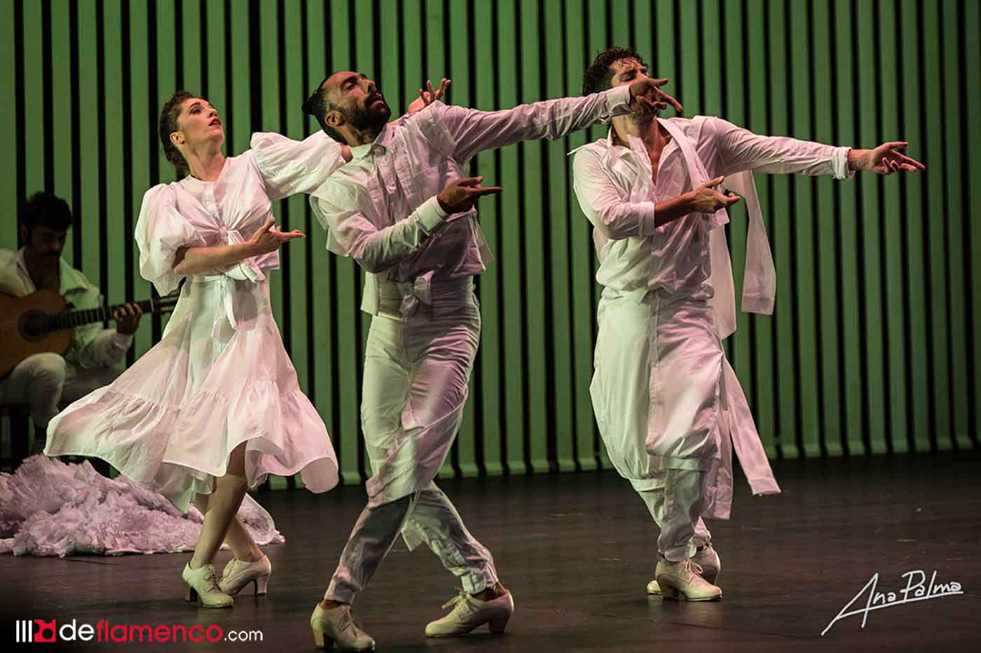 Vestido de blanco el elenco al completo -como para dejarse atravesar por todos los colores y sentires de alrededor-, encadenan números de gran belleza, empezando por el baile a tres digno de la natación sincronizada; un paso a dos entre Eduardo y Sara que es una canción de amor, una nana o un réquiem al mismo tiempo, a lo que seguirá un rico repertorio de bulerías, alegrías, milonga o romance. U otro momento cumbre: el hilarante duelo de pitos de Carnaval que, entre Eduardo y Alberto Sellés, desemboca en unos tanguillos sensuales, chispeantes y que provocaron el gozo general. Todo ello salpimentado con las sacudidas de una poderosa batería de Manuel Reina y los grititos, chasquidos y todo tipo de onomatopeyas imaginables, acaso los jaleos de este siglo, los jaleos 3.0.