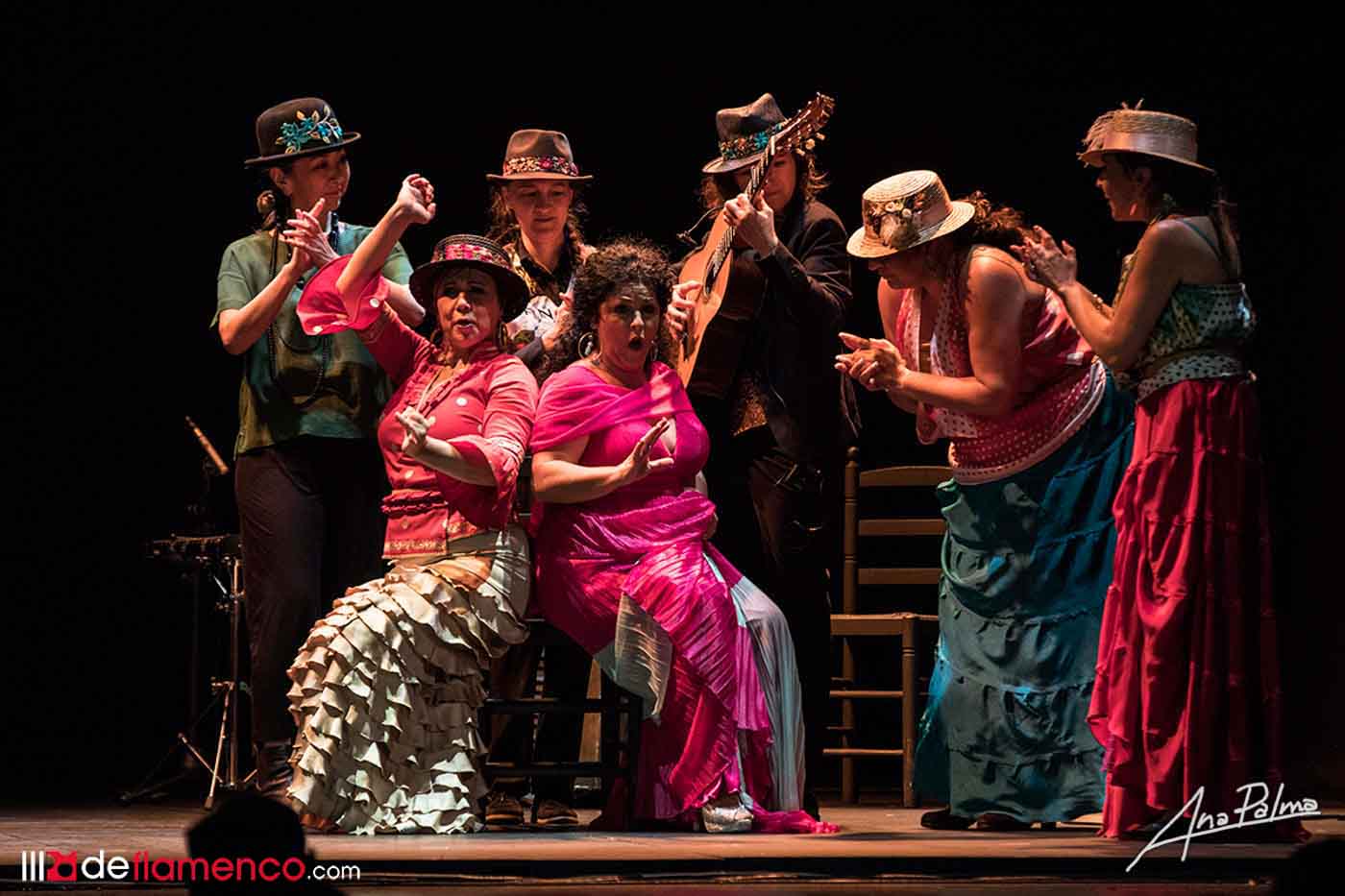 El montaje supone también una declaración de intenciones: el disfrute frente a la pérdida y bucear en otras sensibilidades y formas expresivas. Así lo confirma también la elección de un elenco por un lado conocido pero que por otro nos descubre un ramillete de artistas locales y de la Bahía: a Antonia Jiménez y a Pilar Ogalla ya las teníamos fichadas, pero a Mai Kikuchi al piano y a Elena Jiménez Parra (al clarinete, xilófono, zanfoña y acordeón, y suponemos que no toca más instrumentos porque es materialmente imposible), el círculo flamenco local ni las olía. Y es que esta banda, autodenominada Las Consombrero (en un guiño cómplice a ese grupo de mujeres artistas recientemente redescubiertas) se curró arreglos musicales de Lola Flores, Payaso de Bambino o Testamento Gitano, los tangos del escribano de La Argentinita, a cargo de una picarísima y curvilínea Pilar Ogalla, que indagó en el cante con mucha gracia. De Antonia Jiménez poco más se puede añadir a lo que ya sabemos: que es una guitarrista de primera que siempre suma. Se integró con soltura con el resto de instrumentos y acompañó a Melchora atenta y audaz. Además, anticipó unos tarantos que abrieron boca para su recital como solista de mañana lunes.