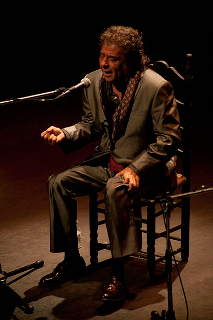 Text: Gonzalo Montaño Peña. Cante: Juan Moneo “El Torta”; Guitar: Diego del Morao; Percussion: Ané Carrasco; Palmas: Chícharo and Gregorio Juan Moneo “El Torta” came to Seville generating the kind of expectation only unpredictable personalities create, people whose ability to perform depends on their mood and health at any given moment, while everyone knows it can all fall apart in the blink of an eye. Recent recitals had been disappointing…notably at the Festival de Jerez where he just didn’t get it together. Nevertheless, on this night, had he been a bullfighter, he’d have walked away from the Teatro Central with two ears, the traditional honor. Diego del Morao opened on his own with bulerías, honoring his father and his entire dynasty with cherished musical variations that have become part of the Jerez flamenco corpus, accompanied by the percussion of Ané Carrasco. Torta came on to launch, almost haphazardly, a couple of tonás, and the first shouts of “ole!” came from the audience who were already sold on this man even before they left home, since years before in fact, and would actually settle for any little crumb Torta was willing to offer. This was followed by alegrías done by the book, and then soleá with some excellent moments that showed what this man is capable of.