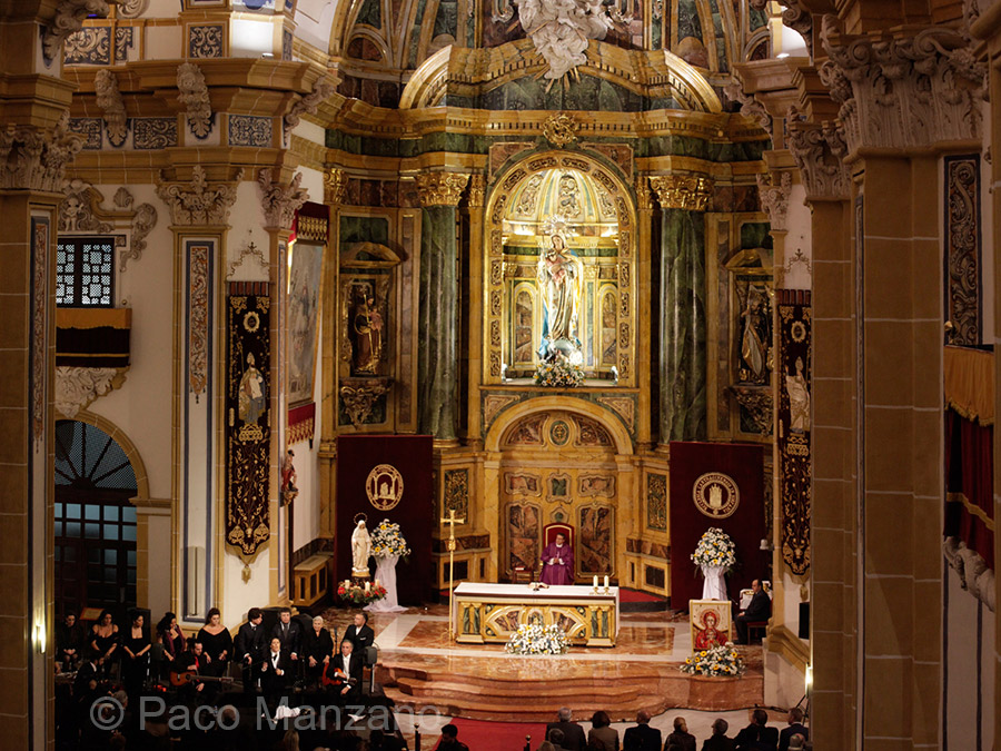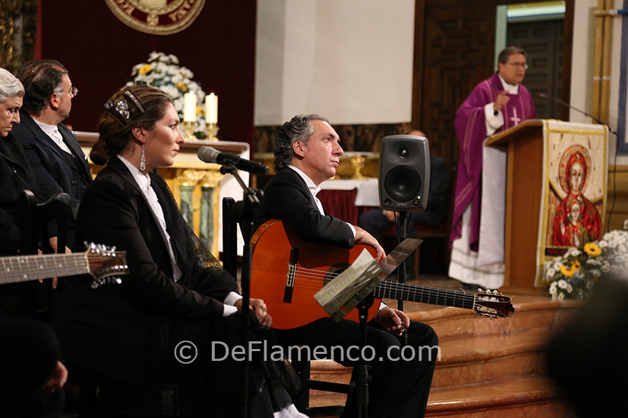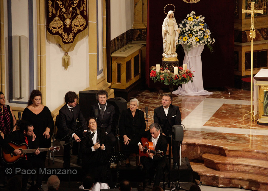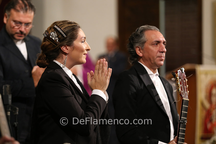 During the mass led by Luis Emilio Pascual, chaplin of the UCAM, the Granada singer interpreted Introito a la celebración (Lope de Vega, Morente), Kirye (Morente), Gloria (Fray Luis de León, Morente), Credo (San Juan de la Cruz, Morente), Agnus Dei (traditional, Morente), Sanctus (Fray Luis de León, traditional, Morente), and the Salve a la Virgen María (P. Garfias, Juan del Encina, Morente).