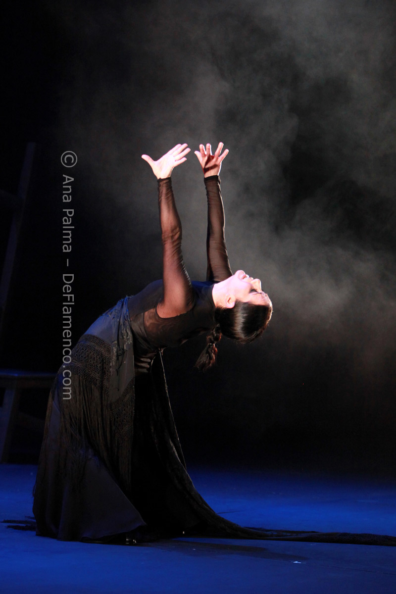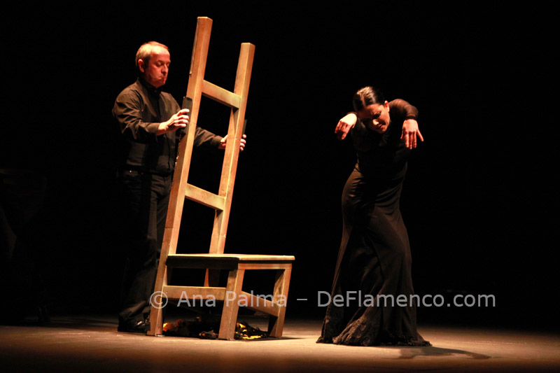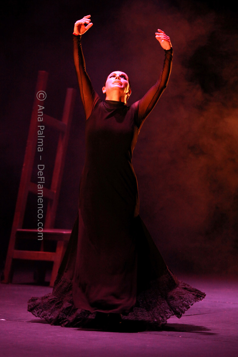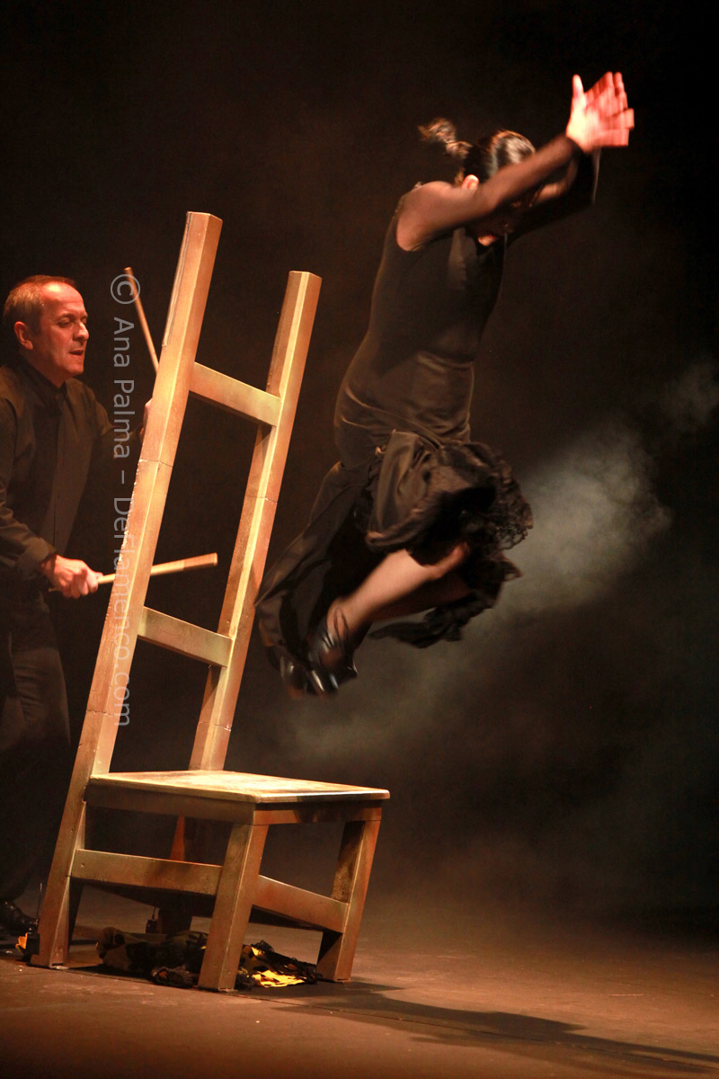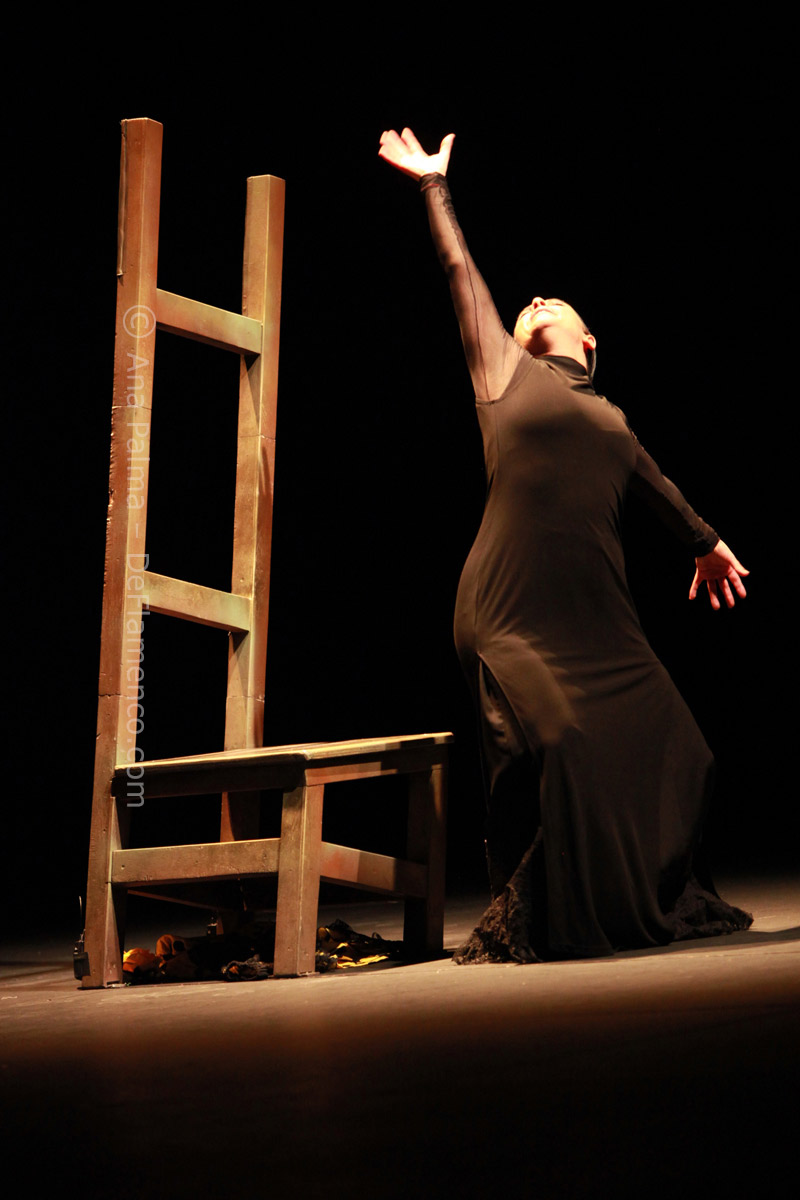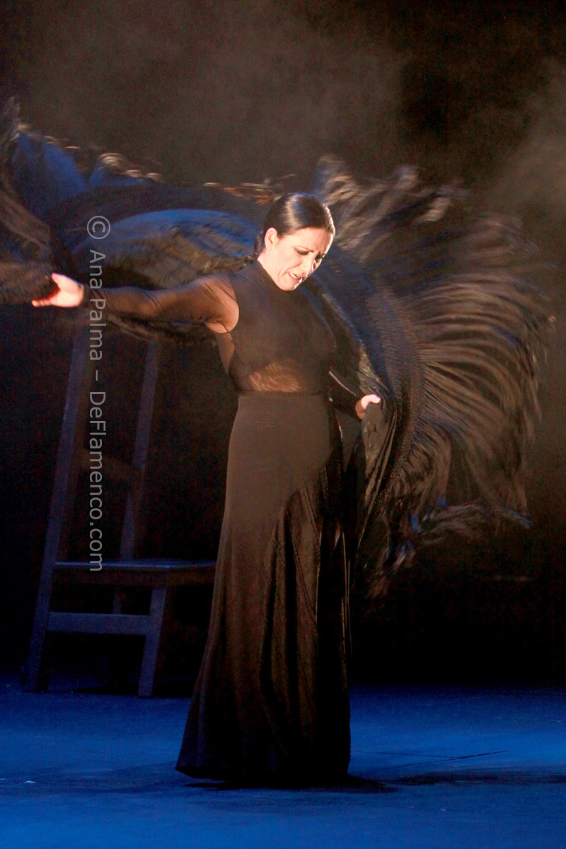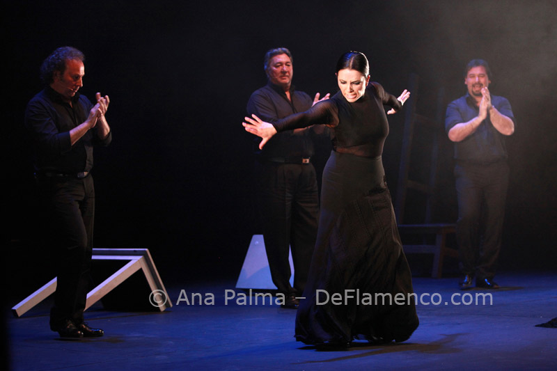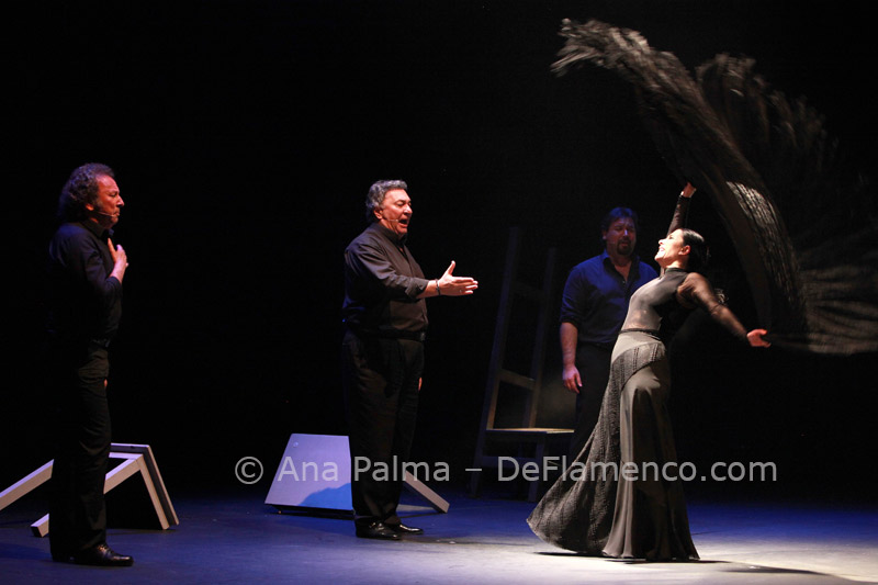 Estos difíciles momentos catárticos suelen ser expresados hacia el comienzo de las obras de Eva…la lentitud, el silencio…(miras el reloj)…movimientos repetitivos que anestesian la mente… No es agradable para la mayoría, y siempre alguno se levanta y abandona el teatro. Pero tenemos la enorme recompensa del atrás inmejorable con las voces de Enrique Extremeño, José Valencia y Juan José Amador, que además ofrecen solos de cante mucho más sustanciosos que un simple relleno, la guitarra (y música) siempre idónea de Paco Jarana, la original y sensible percusión de Antonio Coronel y el acertado violín de Nazar Yasmytskyy.
